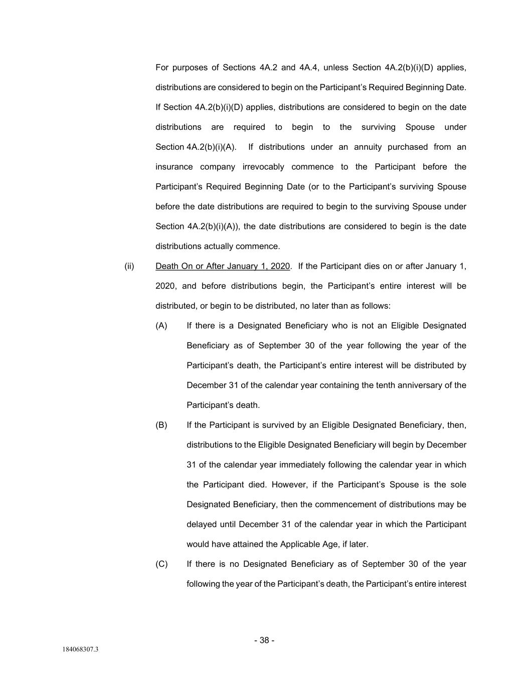 - 38 - 184068307.3 For purposes of Sections 4A.2 and 4A.4, unless Section 4A.2(b)(i)(D) applies, distributions are considered to begin on the Participant’s Required Beginning Date. If Section 4A.2(b)(i)(D) applies, distributions are considered to begin on the date distributions are required to begin to the surviving Spouse under Section 4A.2(b)(i)(A). If distributions under an annuity purchased from an insurance company irrevocably commence to the Participant before the Participant’s Required Beginning Date (or to the Participant’s surviving Spouse before the date distributions are required to begin to the surviving Spouse under Section 4A.2(b)(i)(A)), the date distributions are considered to begin is the date distributions actually commence. (ii) Death On or After January 1, 2020. If the Participant dies on or after January 1, 2020, and before distributions begin, the Participant’s entire interest will be distributed, or begin to be distributed, no later than as follows: (A) If there is a Designated Beneficiary who is not an Eligible Designated Beneficiary as of September 30 of the year following the year of the Participant’s death, the Participant’s entire interest will be distributed by December 31 of the calendar year containing the tenth anniversary of the Participant’s death. (B) If the Participant is survived by an Eligible Designated Beneficiary, then, distributions to the Eligible Designated Beneficiary will begin by December 31 of the calendar year immediately following the calendar year in which the Participant died. However, if the Participant’s Spouse is the sole Designated Beneficiary, then the commencement of distributions may be delayed until December 31 of the calendar year in which the Participant would have attained the Applicable Age, if later. (C) If there is no Designated Beneficiary as of September 30 of the year following the year of the Participant’s death, the Participant’s entire interest