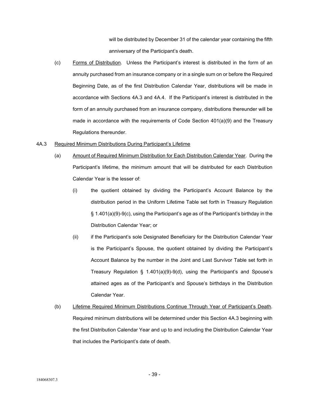 - 39 - 184068307.3 will be distributed by December 31 of the calendar year containing the fifth anniversary of the Participant’s death. (c) Forms of Distribution. Unless the Participant’s interest is distributed in the form of an annuity purchased from an insurance company or in a single sum on or before the Required Beginning Date, as of the first Distribution Calendar Year, distributions will be made in accordance with Sections 4A.3 and 4A.4. If the Participant’s interest is distributed in the form of an annuity purchased from an insurance company, distributions thereunder will be made in accordance with the requirements of Code Section 401(a)(9) and the Treasury Regulations thereunder. 4A.3 Required Minimum Distributions During Participant’s Lifetime (a) Amount of Required Minimum Distribution for Each Distribution Calendar Year. During the Participant’s lifetime, the minimum amount that will be distributed for each Distribution Calendar Year is the lesser of: (i) the quotient obtained by dividing the Participant’s Account Balance by the distribution period in the Uniform Lifetime Table set forth in Treasury Regulation § 1.401(a)(9)-9(c), using the Participant’s age as of the Participant’s birthday in the Distribution Calendar Year; or (ii) if the Participant’s sole Designated Beneficiary for the Distribution Calendar Year is the Participant’s Spouse, the quotient obtained by dividing the Participant’s Account Balance by the number in the Joint and Last Survivor Table set forth in Treasury Regulation § 1.401(a)(9)-9(d), using the Participant’s and Spouse’s attained ages as of the Participant’s and Spouse’s birthdays in the Distribution Calendar Year. (b) Lifetime Required Minimum Distributions Continue Through Year of Participant’s Death. Required minimum distributions will be determined under this Section 4A.3 beginning with the first Distribution Calendar Year and up to and including the Distribution Calendar Year that includes the Participant’s date of death.
