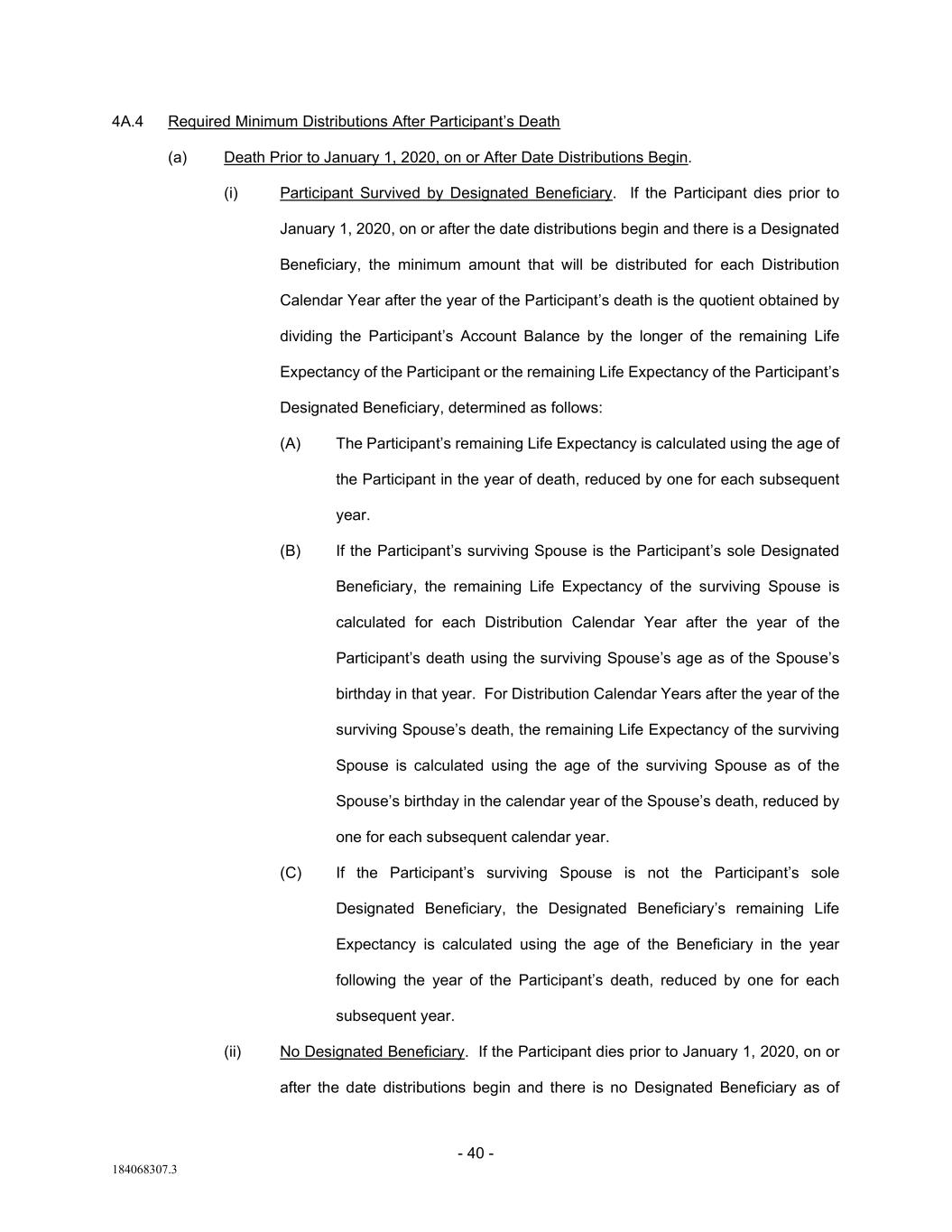- 40 - 184068307.3 4A.4 Required Minimum Distributions After Participant’s Death (a) Death Prior to January 1, 2020, on or After Date Distributions Begin. (i) Participant Survived by Designated Beneficiary. If the Participant dies prior to January 1, 2020, on or after the date distributions begin and there is a Designated Beneficiary, the minimum amount that will be distributed for each Distribution Calendar Year after the year of the Participant’s death is the quotient obtained by dividing the Participant’s Account Balance by the longer of the remaining Life Expectancy of the Participant or the remaining Life Expectancy of the Participant’s Designated Beneficiary, determined as follows: (A) The Participant’s remaining Life Expectancy is calculated using the age of the Participant in the year of death, reduced by one for each subsequent year. (B) If the Participant’s surviving Spouse is the Participant’s sole Designated Beneficiary, the remaining Life Expectancy of the surviving Spouse is calculated for each Distribution Calendar Year after the year of the Participant’s death using the surviving Spouse’s age as of the Spouse’s birthday in that year. For Distribution Calendar Years after the year of the surviving Spouse’s death, the remaining Life Expectancy of the surviving Spouse is calculated using the age of the surviving Spouse as of the Spouse’s birthday in the calendar year of the Spouse’s death, reduced by one for each subsequent calendar year. (C) If the Participant’s surviving Spouse is not the Participant’s sole Designated Beneficiary, the Designated Beneficiary’s remaining Life Expectancy is calculated using the age of the Beneficiary in the year following the year of the Participant’s death, reduced by one for each subsequent year. (ii) No Designated Beneficiary. If the Participant dies prior to January 1, 2020, on or after the date distributions begin and there is no Designated Beneficiary as of