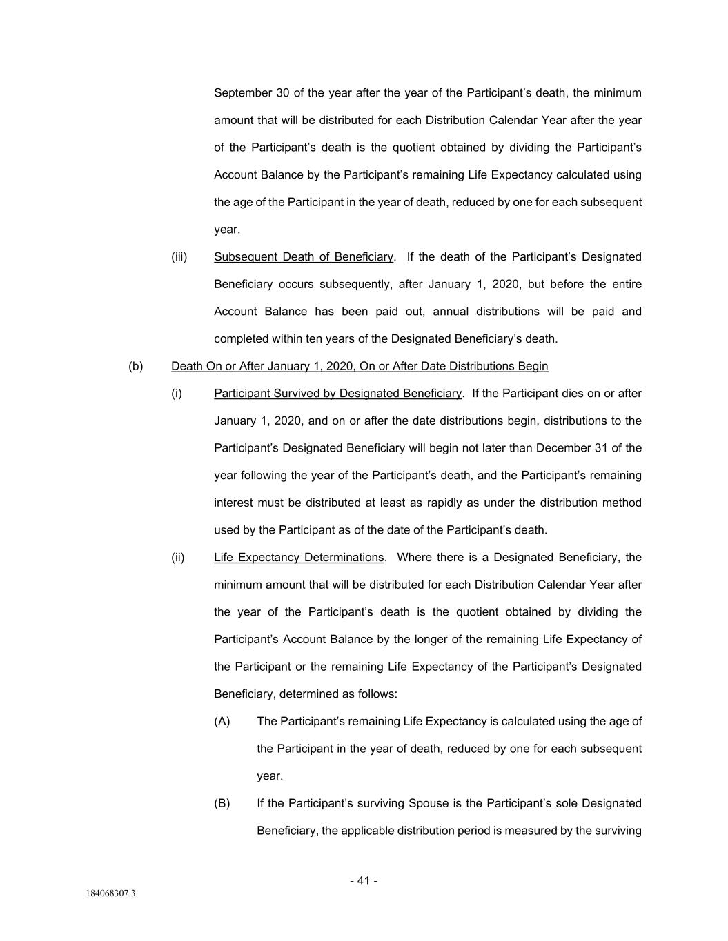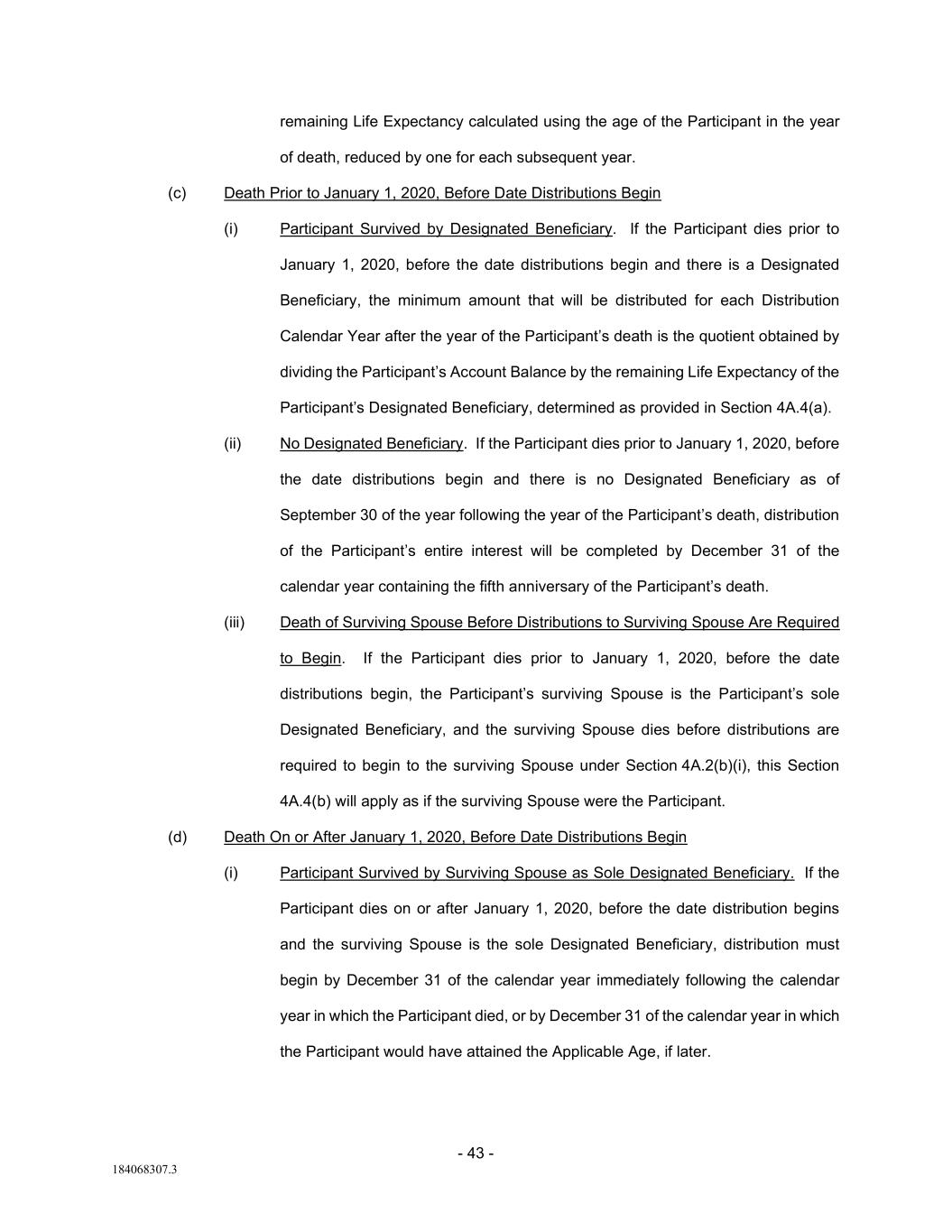 - 43 - 184068307.3 remaining Life Expectancy calculated using the age of the Participant in the year of death, reduced by one for each subsequent year. (c) Death Prior to January 1, 2020, Before Date Distributions Begin (i) Participant Survived by Designated Beneficiary. If the Participant dies prior to January 1, 2020, before the date distributions begin and there is a Designated Beneficiary, the minimum amount that will be distributed for each Distribution Calendar Year after the year of the Participant’s death is the quotient obtained by dividing the Participant’s Account Balance by the remaining Life Expectancy of the Participant’s Designated Beneficiary, determined as provided in Section 4A.4(a). (ii) No Designated Beneficiary. If the Participant dies prior to January 1, 2020, before the date distributions begin and there is no Designated Beneficiary as of September 30 of the year following the year of the Participant’s death, distribution of the Participant’s entire interest will be completed by December 31 of the calendar year containing the fifth anniversary of the Participant’s death. (iii) Death of Surviving Spouse Before Distributions to Surviving Spouse Are Required to Begin. If the Participant dies prior to January 1, 2020, before the date distributions begin, the Participant’s surviving Spouse is the Participant’s sole Designated Beneficiary, and the surviving Spouse dies before distributions are required to begin to the surviving Spouse under Section 4A.2(b)(i), this Section 4A.4(b) will apply as if the surviving Spouse were the Participant. (d) Death On or After January 1, 2020, Before Date Distributions Begin (i) Participant Survived by Surviving Spouse as Sole Designated Beneficiary. If the Participant dies on or after January 1, 2020, before the date distribution begins and the surviving Spouse is the sole Designated Beneficiary, distribution must begin by December 31 of the calendar year immediately following the calendar year in which the Participant died, or by December 31 of the calendar year in which the Participant would have attained the Applicable Age, if later.