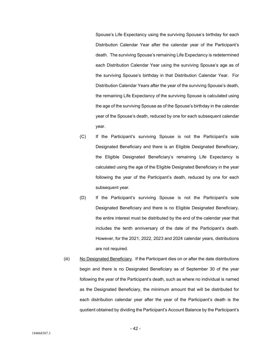 - 42 - 184068307.3 Spouse’s Life Expectancy using the surviving Spouse’s birthday for each Distribution Calendar Year after the calendar year of the Participant’s death. The surviving Spouse’s remaining Life Expectancy is redetermined each Distribution Calendar Year using the surviving Spouse’s age as of the surviving Spouse’s birthday in that Distribution Calendar Year. For Distribution Calendar Years after the year of the surviving Spouse’s death, the remaining Life Expectancy of the surviving Spouse is calculated using the age of the surviving Spouse as of the Spouse’s birthday in the calendar year of the Spouse’s death, reduced by one for each subsequent calendar year. (C) If the Participant’s surviving Spouse is not the Participant’s sole Designated Beneficiary and there is an Eligible Designated Beneficiary, the Eligible Designated Beneficiary’s remaining Life Expectancy is calculated using the age of the Eligible Designated Beneficiary in the year following the year of the Participant’s death, reduced by one for each subsequent year. (D) If the Participant’s surviving Spouse is not the Participant’s sole Designated Beneficiary and there is no Eligible Designated Beneficiary, the entire interest must be distributed by the end of the calendar year that includes the tenth anniversary of the date of the Participant’s death. However, for the 2021, 2022, 2023 and 2024 calendar years, distributions are not required. (iii) No Designated Beneficiary. If the Participant dies on or after the date distributions begin and there is no Designated Beneficiary as of September 30 of the year following the year of the Participant’s death, such as where no individual is named as the Designated Beneficiary, the minimum amount that will be distributed for each distribution calendar year after the year of the Participant’s death is the quotient obtained by dividing the Participant’s Account Balance by the Participant’s