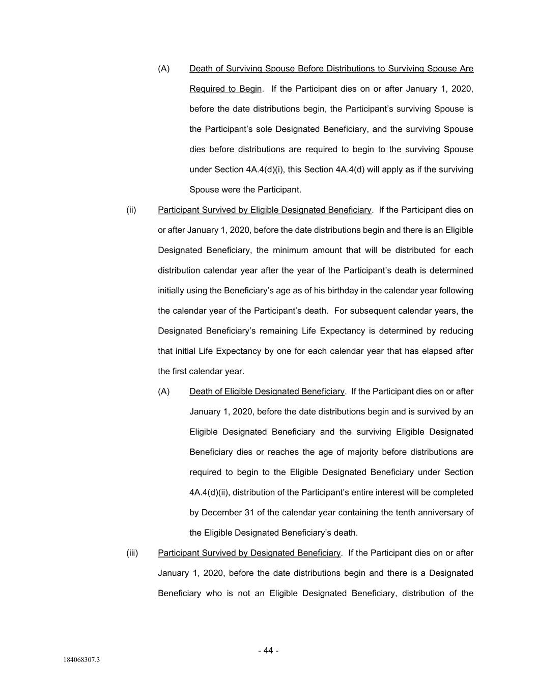 - 44 - 184068307.3 (A) Death of Surviving Spouse Before Distributions to Surviving Spouse Are Required to Begin. If the Participant dies on or after January 1, 2020, before the date distributions begin, the Participant’s surviving Spouse is the Participant’s sole Designated Beneficiary, and the surviving Spouse dies before distributions are required to begin to the surviving Spouse under Section 4A.4(d)(i), this Section 4A.4(d) will apply as if the surviving Spouse were the Participant. (ii) Participant Survived by Eligible Designated Beneficiary. If the Participant dies on or after January 1, 2020, before the date distributions begin and there is an Eligible Designated Beneficiary, the minimum amount that will be distributed for each distribution calendar year after the year of the Participant’s death is determined initially using the Beneficiary’s age as of his birthday in the calendar year following the calendar year of the Participant’s death. For subsequent calendar years, the Designated Beneficiary’s remaining Life Expectancy is determined by reducing that initial Life Expectancy by one for each calendar year that has elapsed after the first calendar year. (A) Death of Eligible Designated Beneficiary. If the Participant dies on or after January 1, 2020, before the date distributions begin and is survived by an Eligible Designated Beneficiary and the surviving Eligible Designated Beneficiary dies or reaches the age of majority before distributions are required to begin to the Eligible Designated Beneficiary under Section 4A.4(d)(ii), distribution of the Participant’s entire interest will be completed by December 31 of the calendar year containing the tenth anniversary of the Eligible Designated Beneficiary’s death. (iii) Participant Survived by Designated Beneficiary. If the Participant dies on or after January 1, 2020, before the date distributions begin and there is a Designated Beneficiary who is not an Eligible Designated Beneficiary, distribution of the