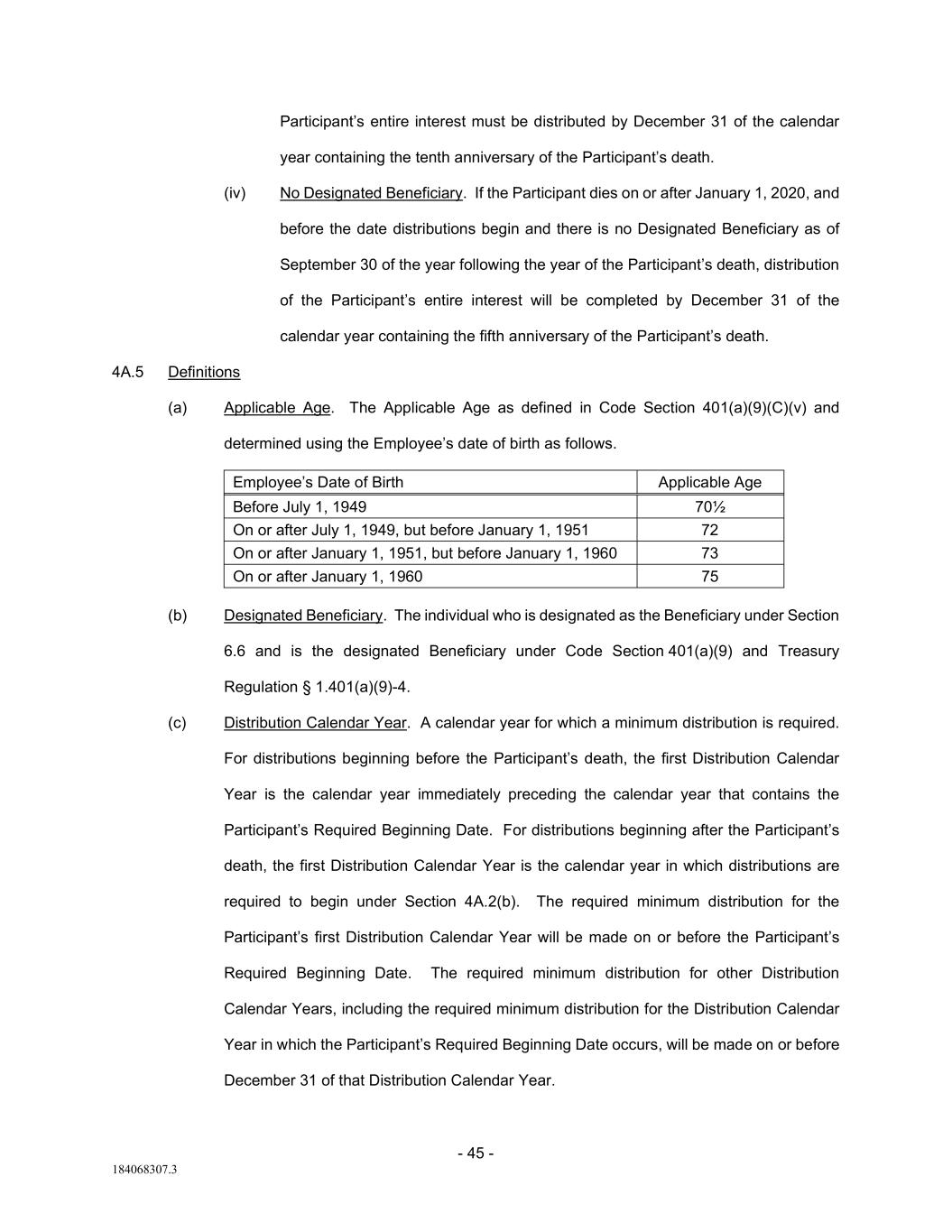 - 45 - 184068307.3 Participant’s entire interest must be distributed by December 31 of the calendar year containing the tenth anniversary of the Participant’s death. (iv) No Designated Beneficiary. If the Participant dies on or after January 1, 2020, and before the date distributions begin and there is no Designated Beneficiary as of September 30 of the year following the year of the Participant’s death, distribution of the Participant’s entire interest will be completed by December 31 of the calendar year containing the fifth anniversary of the Participant’s death. 4A.5 Definitions (a) Applicable Age. The Applicable Age as defined in Code Section 401(a)(9)(C)(v) and determined using the Employee’s date of birth as follows. Employee’s Date of Birth Applicable Age Before July 1, 1949 70½ On or after July 1, 1949, but before January 1, 1951 72 On or after January 1, 1951, but before January 1, 1960 73 On or after January 1, 1960 75 (b) Designated Beneficiary. The individual who is designated as the Beneficiary under Section 6.6 and is the designated Beneficiary under Code Section 401(a)(9) and Treasury Regulation § 1.401(a)(9)-4. (c) Distribution Calendar Year. A calendar year for which a minimum distribution is required. For distributions beginning before the Participant’s death, the first Distribution Calendar Year is the calendar year immediately preceding the calendar year that contains the Participant’s Required Beginning Date. For distributions beginning after the Participant’s death, the first Distribution Calendar Year is the calendar year in which distributions are required to begin under Section 4A.2(b). The required minimum distribution for the Participant’s first Distribution Calendar Year will be made on or before the Participant’s Required Beginning Date. The required minimum distribution for other Distribution Calendar Years, including the required minimum distribution for the Distribution Calendar Year in which the Participant’s Required Beginning Date occurs, will be made on or before December 31 of that Distribution Calendar Year.