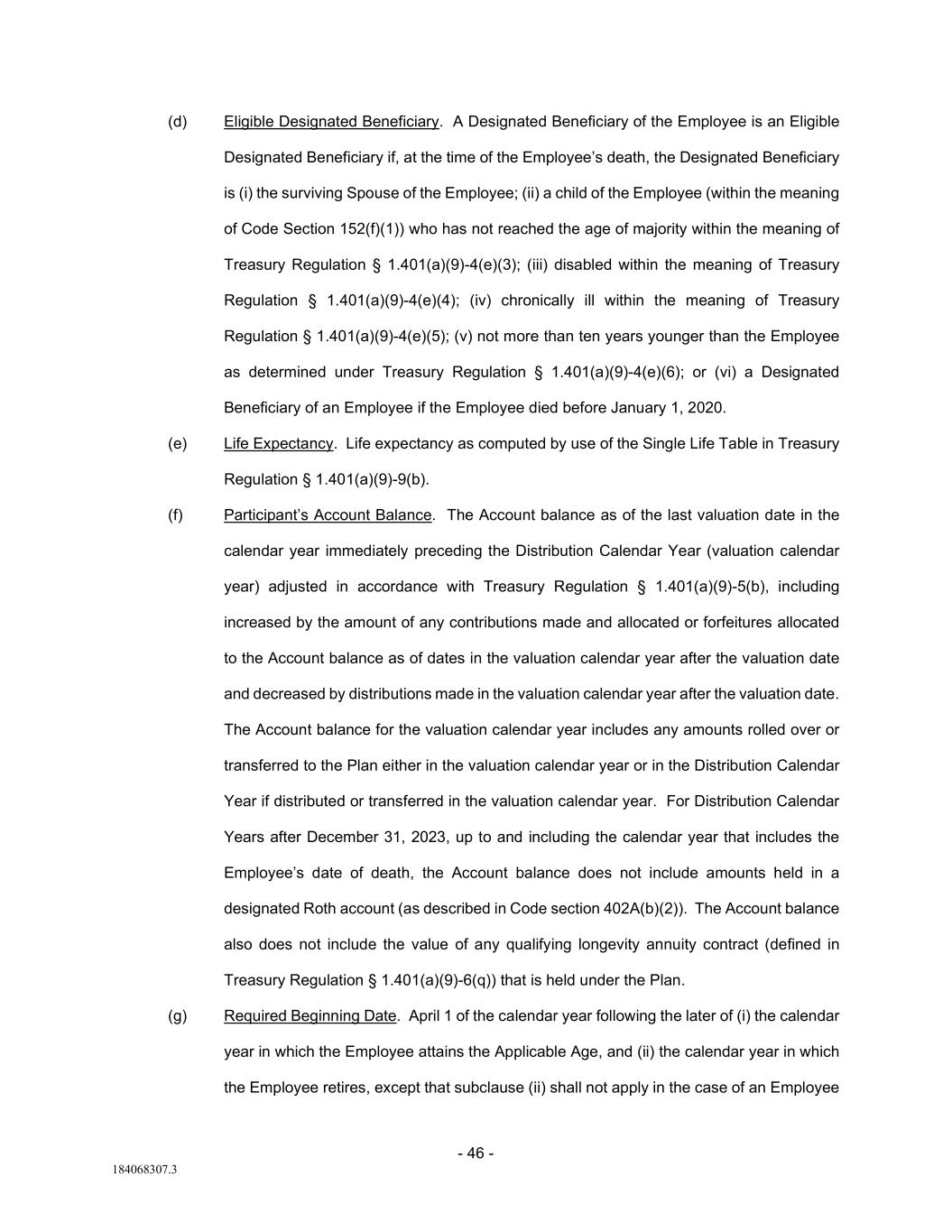 - 46 - 184068307.3 (d) Eligible Designated Beneficiary. A Designated Beneficiary of the Employee is an Eligible Designated Beneficiary if, at the time of the Employee’s death, the Designated Beneficiary is (i) the surviving Spouse of the Employee; (ii) a child of the Employee (within the meaning of Code Section 152(f)(1)) who has not reached the age of majority within the meaning of Treasury Regulation § 1.401(a)(9)-4(e)(3); (iii) disabled within the meaning of Treasury Regulation § 1.401(a)(9)-4(e)(4); (iv) chronically ill within the meaning of Treasury Regulation § 1.401(a)(9)-4(e)(5); (v) not more than ten years younger than the Employee as determined under Treasury Regulation § 1.401(a)(9)-4(e)(6); or (vi) a Designated Beneficiary of an Employee if the Employee died before January 1, 2020. (e) Life Expectancy. Life expectancy as computed by use of the Single Life Table in Treasury Regulation § 1.401(a)(9)-9(b). (f) Participant’s Account Balance. The Account balance as of the last valuation date in the calendar year immediately preceding the Distribution Calendar Year (valuation calendar year) adjusted in accordance with Treasury Regulation § 1.401(a)(9)-5(b), including increased by the amount of any contributions made and allocated or forfeitures allocated to the Account balance as of dates in the valuation calendar year after the valuation date and decreased by distributions made in the valuation calendar year after the valuation date. The Account balance for the valuation calendar year includes any amounts rolled over or transferred to the Plan either in the valuation calendar year or in the Distribution Calendar Year if distributed or transferred in the valuation calendar year. For Distribution Calendar Years after December 31, 2023, up to and including the calendar year that includes the Employee’s date of death, the Account balance does not include amounts held in a designated Roth account (as described in Code section 402A(b)(2)). The Account balance also does not include the value of any qualifying longevity annuity contract (defined in Treasury Regulation § 1.401(a)(9)-6(q)) that is held under the Plan. (g) Required Beginning Date. April 1 of the calendar year following the later of (i) the calendar year in which the Employee attains the Applicable Age, and (ii) the calendar year in which the Employee retires, except that subclause (ii) shall not apply in the case of an Employee