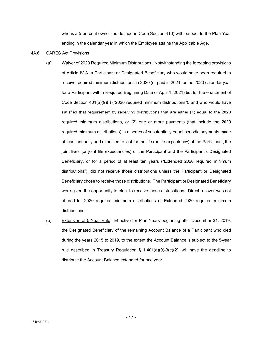 - 47 - 184068307.3 who is a 5-percent owner (as defined in Code Section 416) with respect to the Plan Year ending in the calendar year in which the Employee attains the Applicable Age. 4A.6 CARES Act Provisions (a) Waiver of 2020 Required Minimum Distributions. Notwithstanding the foregoing provisions of Article IV A, a Participant or Designated Beneficiary who would have been required to receive required minimum distributions in 2020 (or paid in 2021 for the 2020 calendar year for a Participant with a Required Beginning Date of April 1, 2021) but for the enactment of Code Section 401(a)(9)(I) (“2020 required minimum distributions”), and who would have satisfied that requirement by receiving distributions that are either (1) equal to the 2020 required minimum distributions, or (2) one or more payments (that include the 2020 required minimum distributions) in a series of substantially equal periodic payments made at least annually and expected to last for the life (or life expectancy) of the Participant, the joint lives (or joint life expectancies) of the Participant and the Participant’s Designated Beneficiary, or for a period of at least ten years (“Extended 2020 required minimum distributions”), did not receive those distributions unless the Participant or Designated Beneficiary chose to receive those distributions. The Participant or Designated Beneficiary were given the opportunity to elect to receive those distributions. Direct rollover was not offered for 2020 required minimum distributions or Extended 2020 required minimum distributions. (b) Extension of 5-Year Rule. Effective for Plan Years beginning after December 31, 2019, the Designated Beneficiary of the remaining Account Balance of a Participant who died during the years 2015 to 2019, to the extent the Account Balance is subject to the 5-year rule described in Treasury Regulation § 1.401(a)(9)-3(c)(2), will have the deadline to distribute the Account Balance extended for one year.