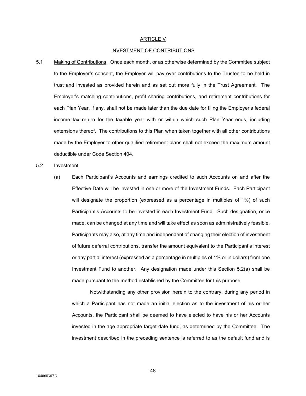 - 48 - 184068307.3 ARTICLE V INVESTMENT OF CONTRIBUTIONS 5.1 Making of Contributions. Once each month, or as otherwise determined by the Committee subject to the Employer’s consent, the Employer will pay over contributions to the Trustee to be held in trust and invested as provided herein and as set out more fully in the Trust Agreement. The Employer’s matching contributions, profit sharing contributions, and retirement contributions for each Plan Year, if any, shall not be made later than the due date for filing the Employer’s federal income tax return for the taxable year with or within which such Plan Year ends, including extensions thereof. The contributions to this Plan when taken together with all other contributions made by the Employer to other qualified retirement plans shall not exceed the maximum amount deductible under Code Section 404. 5.2 Investment (a) Each Participant’s Accounts and earnings credited to such Accounts on and after the Effective Date will be invested in one or more of the Investment Funds. Each Participant will designate the proportion (expressed as a percentage in multiples of 1%) of such Participant’s Accounts to be invested in each Investment Fund. Such designation, once made, can be changed at any time and will take effect as soon as administratively feasible. Participants may also, at any time and independent of changing their election of investment of future deferral contributions, transfer the amount equivalent to the Participant’s interest or any partial interest (expressed as a percentage in multiples of 1% or in dollars) from one Investment Fund to another. Any designation made under this Section 5.2(a) shall be made pursuant to the method established by the Committee for this purpose. Notwithstanding any other provision herein to the contrary, during any period in which a Participant has not made an initial election as to the investment of his or her Accounts, the Participant shall be deemed to have elected to have his or her Accounts invested in the age appropriate target date fund, as determined by the Committee. The investment described in the preceding sentence is referred to as the default fund and is