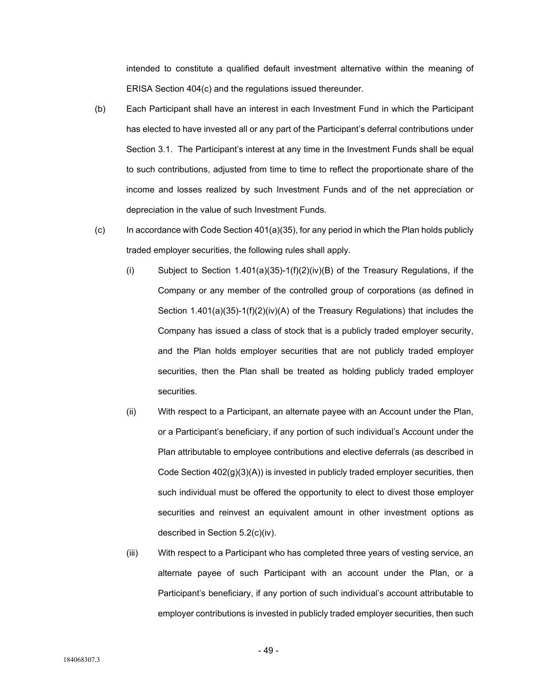 - 49 - 184068307.3 intended to constitute a qualified default investment alternative within the meaning of ERISA Section 404(c) and the regulations issued thereunder. (b) Each Participant shall have an interest in each Investment Fund in which the Participant has elected to have invested all or any part of the Participant’s deferral contributions under Section 3.1. The Participant’s interest at any time in the Investment Funds shall be equal to such contributions, adjusted from time to time to reflect the proportionate share of the income and losses realized by such Investment Funds and of the net appreciation or depreciation in the value of such Investment Funds. (c) In accordance with Code Section 401(a)(35), for any period in which the Plan holds publicly traded employer securities, the following rules shall apply. (i) Subject to Section 1.401(a)(35)-1(f)(2)(iv)(B) of the Treasury Regulations, if the Company or any member of the controlled group of corporations (as defined in Section 1.401(a)(35)-1(f)(2)(iv)(A) of the Treasury Regulations) that includes the Company has issued a class of stock that is a publicly traded employer security, and the Plan holds employer securities that are not publicly traded employer securities, then the Plan shall be treated as holding publicly traded employer securities. (ii) With respect to a Participant, an alternate payee with an Account under the Plan, or a Participant’s beneficiary, if any portion of such individual’s Account under the Plan attributable to employee contributions and elective deferrals (as described in Code Section 402(g)(3)(A)) is invested in publicly traded employer securities, then such individual must be offered the opportunity to elect to divest those employer securities and reinvest an equivalent amount in other investment options as described in Section 5.2(c)(iv). (iii) With respect to a Participant who has completed three years of vesting service, an alternate payee of such Participant with an account under the Plan, or a Participant’s beneficiary, if any portion of such individual’s account attributable to employer contributions is invested in publicly traded employer securities, then such
