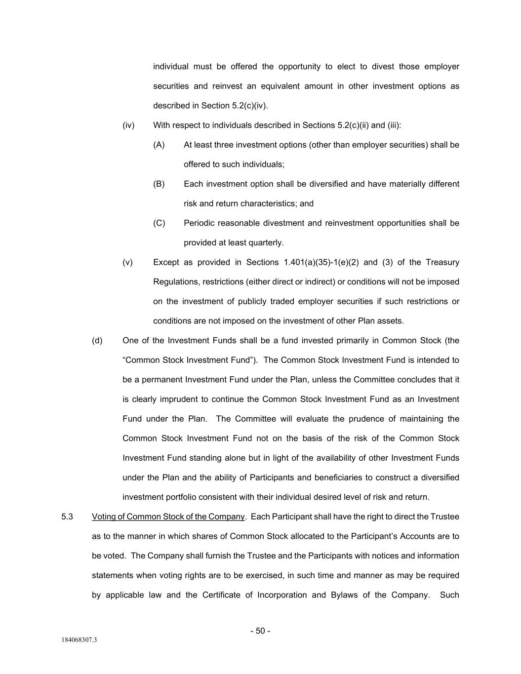 - 50 - 184068307.3 individual must be offered the opportunity to elect to divest those employer securities and reinvest an equivalent amount in other investment options as described in Section 5.2(c)(iv). (iv) With respect to individuals described in Sections 5.2(c)(ii) and (iii): (A) At least three investment options (other than employer securities) shall be offered to such individuals; (B) Each investment option shall be diversified and have materially different risk and return characteristics; and (C) Periodic reasonable divestment and reinvestment opportunities shall be provided at least quarterly. (v) Except as provided in Sections 1.401(a)(35)-1(e)(2) and (3) of the Treasury Regulations, restrictions (either direct or indirect) or conditions will not be imposed on the investment of publicly traded employer securities if such restrictions or conditions are not imposed on the investment of other Plan assets. (d) One of the Investment Funds shall be a fund invested primarily in Common Stock (the “Common Stock Investment Fund”). The Common Stock Investment Fund is intended to be a permanent Investment Fund under the Plan, unless the Committee concludes that it is clearly imprudent to continue the Common Stock Investment Fund as an Investment Fund under the Plan. The Committee will evaluate the prudence of maintaining the Common Stock Investment Fund not on the basis of the risk of the Common Stock Investment Fund standing alone but in light of the availability of other Investment Funds under the Plan and the ability of Participants and beneficiaries to construct a diversified investment portfolio consistent with their individual desired level of risk and return. 5.3 Voting of Common Stock of the Company. Each Participant shall have the right to direct the Trustee as to the manner in which shares of Common Stock allocated to the Participant’s Accounts are to be voted. The Company shall furnish the Trustee and the Participants with notices and information statements when voting rights are to be exercised, in such time and manner as may be required by applicable law and the Certificate of Incorporation and Bylaws of the Company. Such