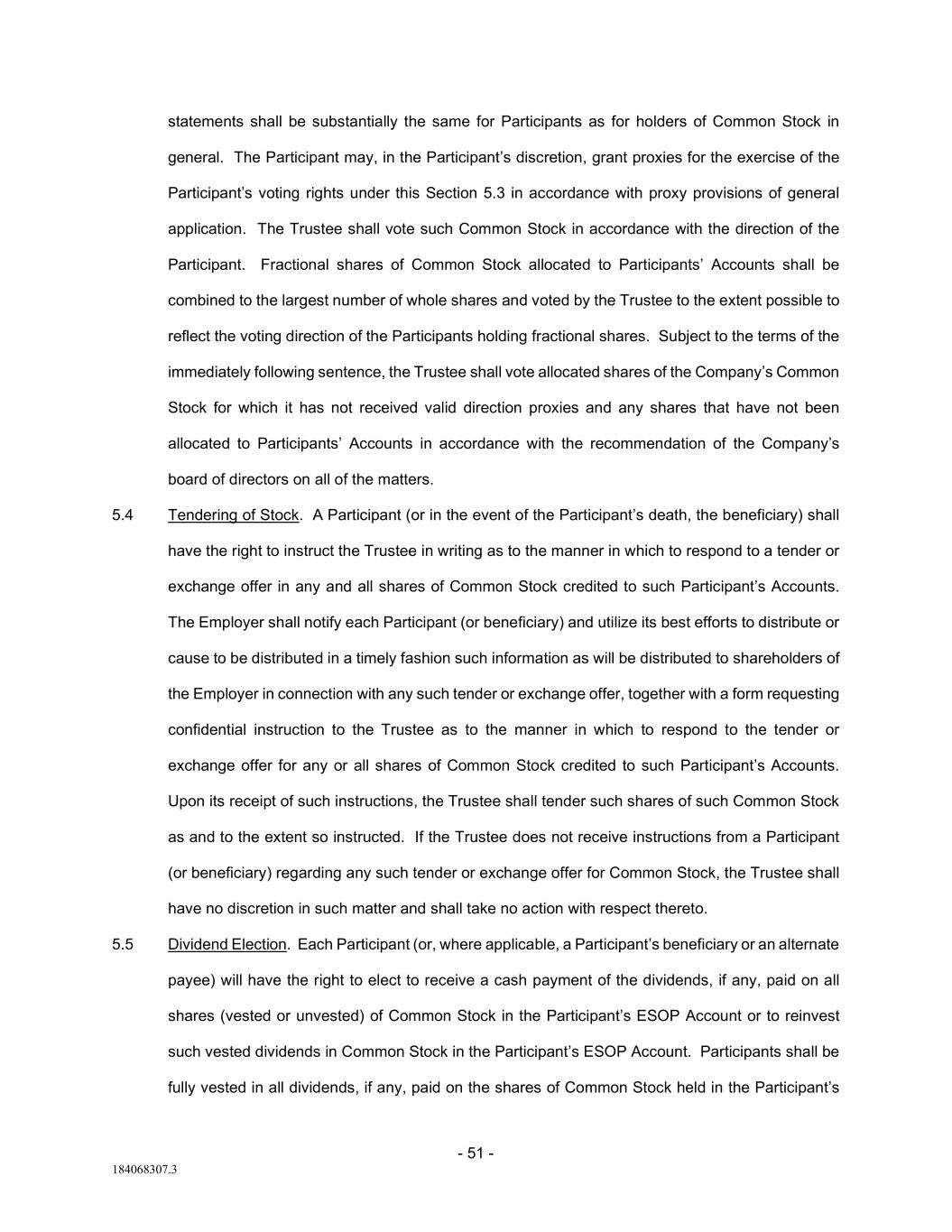 - 51 - 184068307.3 statements shall be substantially the same for Participants as for holders of Common Stock in general. The Participant may, in the Participant’s discretion, grant proxies for the exercise of the Participant’s voting rights under this Section 5.3 in accordance with proxy provisions of general application. The Trustee shall vote such Common Stock in accordance with the direction of the Participant. Fractional shares of Common Stock allocated to Participants’ Accounts shall be combined to the largest number of whole shares and voted by the Trustee to the extent possible to reflect the voting direction of the Participants holding fractional shares. Subject to the terms of the immediately following sentence, the Trustee shall vote allocated shares of the Company’s Common Stock for which it has not received valid direction proxies and any shares that have not been allocated to Participants’ Accounts in accordance with the recommendation of the Company’s board of directors on all of the matters. 5.4 Tendering of Stock. A Participant (or in the event of the Participant’s death, the beneficiary) shall have the right to instruct the Trustee in writing as to the manner in which to respond to a tender or exchange offer in any and all shares of Common Stock credited to such Participant’s Accounts. The Employer shall notify each Participant (or beneficiary) and utilize its best efforts to distribute or cause to be distributed in a timely fashion such information as will be distributed to shareholders of the Employer in connection with any such tender or exchange offer, together with a form requesting confidential instruction to the Trustee as to the manner in which to respond to the tender or exchange offer for any or all shares of Common Stock credited to such Participant’s Accounts. Upon its receipt of such instructions, the Trustee shall tender such shares of such Common Stock as and to the extent so instructed. If the Trustee does not receive instructions from a Participant (or beneficiary) regarding any such tender or exchange offer for Common Stock, the Trustee shall have no discretion in such matter and shall take no action with respect thereto. 5.5 Dividend Election. Each Participant (or, where applicable, a Participant’s beneficiary or an alternate payee) will have the right to elect to receive a cash payment of the dividends, if any, paid on all shares (vested or unvested) of Common Stock in the Participant’s ESOP Account or to reinvest such vested dividends in Common Stock in the Participant’s ESOP Account. Participants shall be fully vested in all dividends, if any, paid on the shares of Common Stock held in the Participant’s