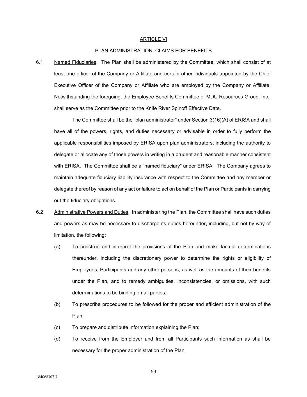 - 53 - 184068307.3 ARTICLE VI PLAN ADMINISTRATION; CLAIMS FOR BENEFITS 6.1 Named Fiduciaries. The Plan shall be administered by the Committee, which shall consist of at least one officer of the Company or Affiliate and certain other individuals appointed by the Chief Executive Officer of the Company or Affiliate who are employed by the Company or Affiliate. Notwithstanding the foregoing, the Employee Benefits Committee of MDU Resources Group, Inc., shall serve as the Committee prior to the Knife River Spinoff Effective Date. The Committee shall be the “plan administrator” under Section 3(16)(A) of ERISA and shall have all of the powers, rights, and duties necessary or advisable in order to fully perform the applicable responsibilities imposed by ERISA upon plan administrators, including the authority to delegate or allocate any of those powers in writing in a prudent and reasonable manner consistent with ERISA. The Committee shall be a “named fiduciary” under ERISA. The Company agrees to maintain adequate fiduciary liability insurance with respect to the Committee and any member or delegate thereof by reason of any act or failure to act on behalf of the Plan or Participants in carrying out the fiduciary obligations. 6.2 Administrative Powers and Duties. In administering the Plan, the Committee shall have such duties and powers as may be necessary to discharge its duties hereunder, including, but not by way of limitation, the following: (a) To construe and interpret the provisions of the Plan and make factual determinations thereunder, including the discretionary power to determine the rights or eligibility of Employees, Participants and any other persons, as well as the amounts of their benefits under the Plan, and to remedy ambiguities, inconsistencies, or omissions, with such determinations to be binding on all parties; (b) To prescribe procedures to be followed for the proper and efficient administration of the Plan; (c) To prepare and distribute information explaining the Plan; (d) To receive from the Employer and from all Participants such information as shall be necessary for the proper administration of the Plan;