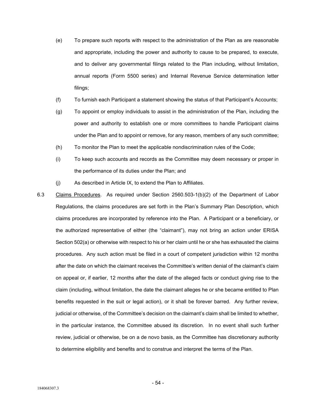 - 54 - 184068307.3 (e) To prepare such reports with respect to the administration of the Plan as are reasonable and appropriate, including the power and authority to cause to be prepared, to execute, and to deliver any governmental filings related to the Plan including, without limitation, annual reports (Form 5500 series) and Internal Revenue Service determination letter filings; (f) To furnish each Participant a statement showing the status of that Participant’s Accounts; (g) To appoint or employ individuals to assist in the administration of the Plan, including the power and authority to establish one or more committees to handle Participant claims under the Plan and to appoint or remove, for any reason, members of any such committee; (h) To monitor the Plan to meet the applicable nondiscrimination rules of the Code; (i) To keep such accounts and records as the Committee may deem necessary or proper in the performance of its duties under the Plan; and (j) As described in Article IX, to extend the Plan to Affiliates. 6.3 Claims Procedures. As required under Section 2560.503-1(b)(2) of the Department of Labor Regulations, the claims procedures are set forth in the Plan’s Summary Plan Description, which claims procedures are incorporated by reference into the Plan. A Participant or a beneficiary, or the authorized representative of either (the “claimant”), may not bring an action under ERISA Section 502(a) or otherwise with respect to his or her claim until he or she has exhausted the claims procedures. Any such action must be filed in a court of competent jurisdiction within 12 months after the date on which the claimant receives the Committee’s written denial of the claimant’s claim on appeal or, if earlier, 12 months after the date of the alleged facts or conduct giving rise to the claim (including, without limitation, the date the claimant alleges he or she became entitled to Plan benefits requested in the suit or legal action), or it shall be forever barred. Any further review, judicial or otherwise, of the Committee’s decision on the claimant’s claim shall be limited to whether, in the particular instance, the Committee abused its discretion. In no event shall such further review, judicial or otherwise, be on a de novo basis, as the Committee has discretionary authority to determine eligibility and benefits and to construe and interpret the terms of the Plan.