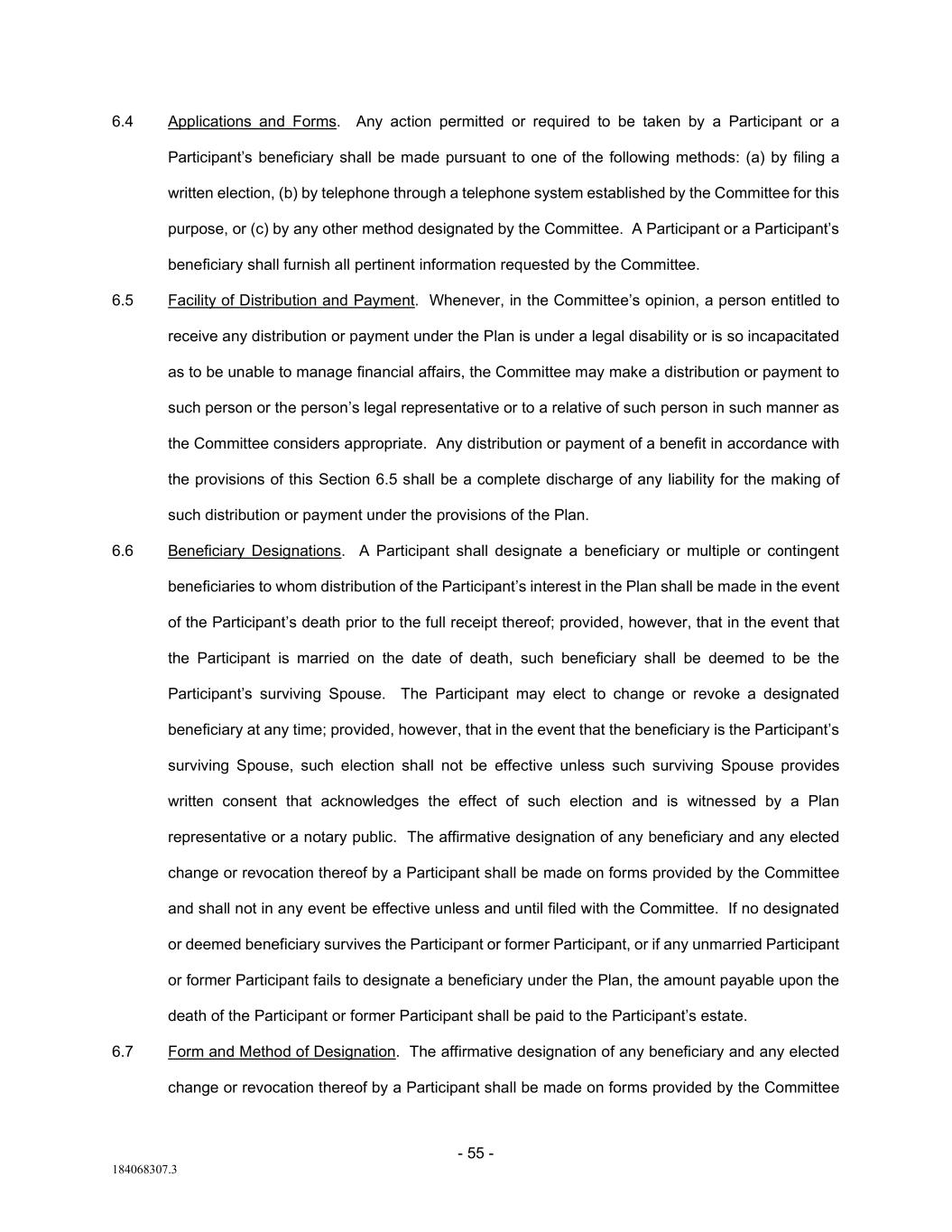 - 55 - 184068307.3 6.4 Applications and Forms. Any action permitted or required to be taken by a Participant or a Participant’s beneficiary shall be made pursuant to one of the following methods: (a) by filing a written election, (b) by telephone through a telephone system established by the Committee for this purpose, or (c) by any other method designated by the Committee. A Participant or a Participant’s beneficiary shall furnish all pertinent information requested by the Committee. 6.5 Facility of Distribution and Payment. Whenever, in the Committee’s opinion, a person entitled to receive any distribution or payment under the Plan is under a legal disability or is so incapacitated as to be unable to manage financial affairs, the Committee may make a distribution or payment to such person or the person’s legal representative or to a relative of such person in such manner as the Committee considers appropriate. Any distribution or payment of a benefit in accordance with the provisions of this Section 6.5 shall be a complete discharge of any liability for the making of such distribution or payment under the provisions of the Plan. 6.6 Beneficiary Designations. A Participant shall designate a beneficiary or multiple or contingent beneficiaries to whom distribution of the Participant’s interest in the Plan shall be made in the event of the Participant’s death prior to the full receipt thereof; provided, however, that in the event that the Participant is married on the date of death, such beneficiary shall be deemed to be the Participant’s surviving Spouse. The Participant may elect to change or revoke a designated beneficiary at any time; provided, however, that in the event that the beneficiary is the Participant’s surviving Spouse, such election shall not be effective unless such surviving Spouse provides written consent that acknowledges the effect of such election and is witnessed by a Plan representative or a notary public. The affirmative designation of any beneficiary and any elected change or revocation thereof by a Participant shall be made on forms provided by the Committee and shall not in any event be effective unless and until filed with the Committee. If no designated or deemed beneficiary survives the Participant or former Participant, or if any unmarried Participant or former Participant fails to designate a beneficiary under the Plan, the amount payable upon the death of the Participant or former Participant shall be paid to the Participant’s estate. 6.7 Form and Method of Designation. The affirmative designation of any beneficiary and any elected change or revocation thereof by a Participant shall be made on forms provided by the Committee