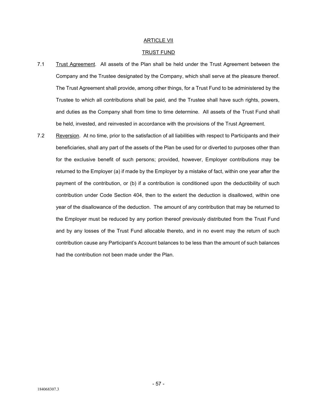 - 57 - 184068307.3 ARTICLE VII TRUST FUND 7.1 Trust Agreement. All assets of the Plan shall be held under the Trust Agreement between the Company and the Trustee designated by the Company, which shall serve at the pleasure thereof. The Trust Agreement shall provide, among other things, for a Trust Fund to be administered by the Trustee to which all contributions shall be paid, and the Trustee shall have such rights, powers, and duties as the Company shall from time to time determine. All assets of the Trust Fund shall be held, invested, and reinvested in accordance with the provisions of the Trust Agreement. 7.2 Reversion. At no time, prior to the satisfaction of all liabilities with respect to Participants and their beneficiaries, shall any part of the assets of the Plan be used for or diverted to purposes other than for the exclusive benefit of such persons; provided, however, Employer contributions may be returned to the Employer (a) if made by the Employer by a mistake of fact, within one year after the payment of the contribution, or (b) if a contribution is conditioned upon the deductibility of such contribution under Code Section 404, then to the extent the deduction is disallowed, within one year of the disallowance of the deduction. The amount of any contribution that may be returned to the Employer must be reduced by any portion thereof previously distributed from the Trust Fund and by any losses of the Trust Fund allocable thereto, and in no event may the return of such contribution cause any Participant’s Account balances to be less than the amount of such balances had the contribution not been made under the Plan.