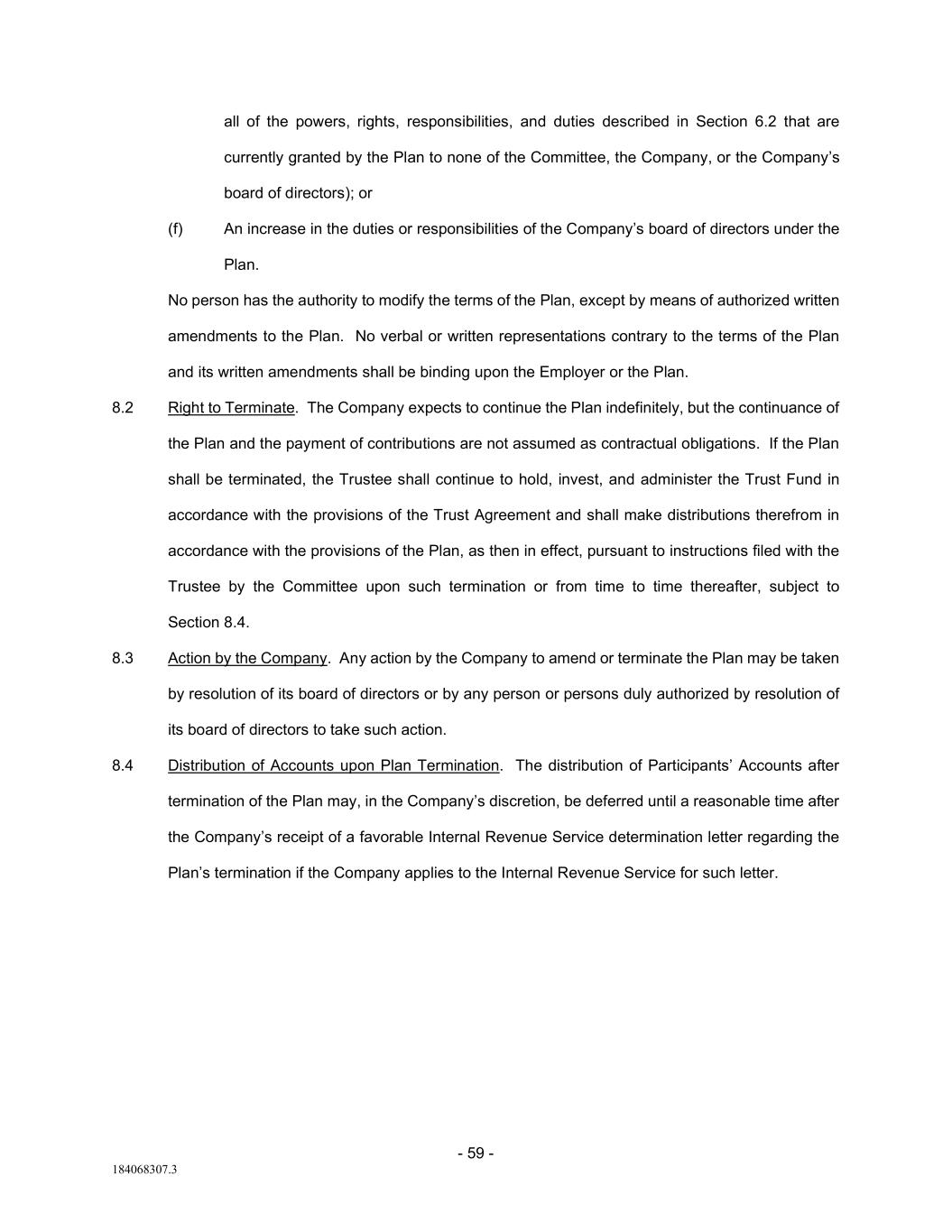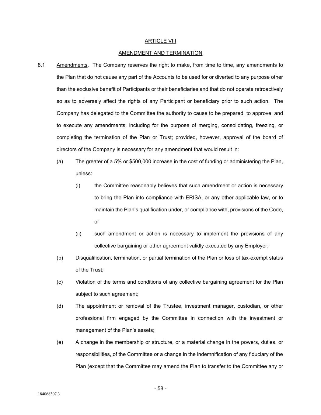 - 58 - 184068307.3 ARTICLE VIII AMENDMENT AND TERMINATION 8.1 Amendments. The Company reserves the right to make, from time to time, any amendments to the Plan that do not cause any part of the Accounts to be used for or diverted to any purpose other than the exclusive benefit of Participants or their beneficiaries and that do not operate retroactively so as to adversely affect the rights of any Participant or beneficiary prior to such action. The Company has delegated to the Committee the authority to cause to be prepared, to approve, and to execute any amendments, including for the purpose of merging, consolidating, freezing, or completing the termination of the Plan or Trust; provided, however, approval of the board of directors of the Company is necessary for any amendment that would result in: (a) The greater of a 5% or $500,000 increase in the cost of funding or administering the Plan, unless: (i) the Committee reasonably believes that such amendment or action is necessary to bring the Plan into compliance with ERISA, or any other applicable law, or to maintain the Plan’s qualification under, or compliance with, provisions of the Code, or (ii) such amendment or action is necessary to implement the provisions of any collective bargaining or other agreement validly executed by any Employer; (b) Disqualification, termination, or partial termination of the Plan or loss of tax-exempt status of the Trust; (c) Violation of the terms and conditions of any collective bargaining agreement for the Plan subject to such agreement; (d) The appointment or removal of the Trustee, investment manager, custodian, or other professional firm engaged by the Committee in connection with the investment or management of the Plan’s assets; (e) A change in the membership or structure, or a material change in the powers, duties, or responsibilities, of the Committee or a change in the indemnification of any fiduciary of the Plan (except that the Committee may amend the Plan to transfer to the Committee any or