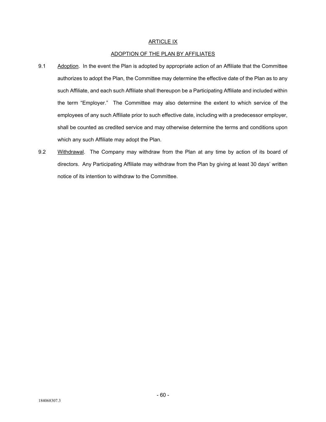 - 60 - 184068307.3 ARTICLE IX ADOPTION OF THE PLAN BY AFFILIATES 9.1 Adoption. In the event the Plan is adopted by appropriate action of an Affiliate that the Committee authorizes to adopt the Plan, the Committee may determine the effective date of the Plan as to any such Affiliate, and each such Affiliate shall thereupon be a Participating Affiliate and included within the term “Employer.” The Committee may also determine the extent to which service of the employees of any such Affiliate prior to such effective date, including with a predecessor employer, shall be counted as credited service and may otherwise determine the terms and conditions upon which any such Affiliate may adopt the Plan. 9.2 Withdrawal. The Company may withdraw from the Plan at any time by action of its board of directors. Any Participating Affiliate may withdraw from the Plan by giving at least 30 days’ written notice of its intention to withdraw to the Committee.