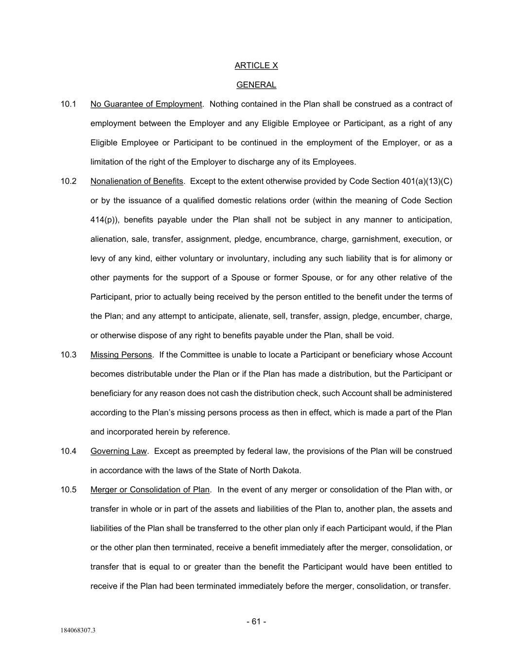 - 61 - 184068307.3 ARTICLE X GENERAL 10.1 No Guarantee of Employment. Nothing contained in the Plan shall be construed as a contract of employment between the Employer and any Eligible Employee or Participant, as a right of any Eligible Employee or Participant to be continued in the employment of the Employer, or as a limitation of the right of the Employer to discharge any of its Employees. 10.2 Nonalienation of Benefits. Except to the extent otherwise provided by Code Section 401(a)(13)(C) or by the issuance of a qualified domestic relations order (within the meaning of Code Section 414(p)), benefits payable under the Plan shall not be subject in any manner to anticipation, alienation, sale, transfer, assignment, pledge, encumbrance, charge, garnishment, execution, or levy of any kind, either voluntary or involuntary, including any such liability that is for alimony or other payments for the support of a Spouse or former Spouse, or for any other relative of the Participant, prior to actually being received by the person entitled to the benefit under the terms of the Plan; and any attempt to anticipate, alienate, sell, transfer, assign, pledge, encumber, charge, or otherwise dispose of any right to benefits payable under the Plan, shall be void. 10.3 Missing Persons. If the Committee is unable to locate a Participant or beneficiary whose Account becomes distributable under the Plan or if the Plan has made a distribution, but the Participant or beneficiary for any reason does not cash the distribution check, such Account shall be administered according to the Plan’s missing persons process as then in effect, which is made a part of the Plan and incorporated herein by reference. 10.4 Governing Law. Except as preempted by federal law, the provisions of the Plan will be construed in accordance with the laws of the State of North Dakota. 10.5 Merger or Consolidation of Plan. In the event of any merger or consolidation of the Plan with, or transfer in whole or in part of the assets and liabilities of the Plan to, another plan, the assets and liabilities of the Plan shall be transferred to the other plan only if each Participant would, if the Plan or the other plan then terminated, receive a benefit immediately after the merger, consolidation, or transfer that is equal to or greater than the benefit the Participant would have been entitled to receive if the Plan had been terminated immediately before the merger, consolidation, or transfer.