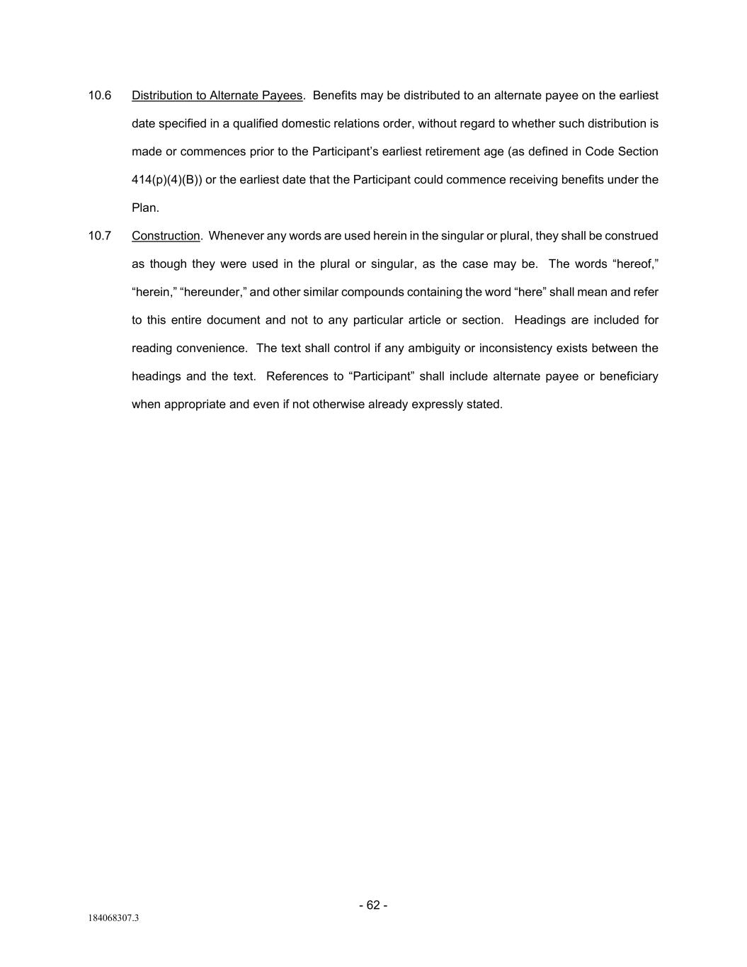 - 62 - 184068307.3 10.6 Distribution to Alternate Payees. Benefits may be distributed to an alternate payee on the earliest date specified in a qualified domestic relations order, without regard to whether such distribution is made or commences prior to the Participant’s earliest retirement age (as defined in Code Section 414(p)(4)(B)) or the earliest date that the Participant could commence receiving benefits under the Plan. 10.7 Construction. Whenever any words are used herein in the singular or plural, they shall be construed as though they were used in the plural or singular, as the case may be. The words “hereof,” “herein,” “hereunder,” and other similar compounds containing the word “here” shall mean and refer to this entire document and not to any particular article or section. Headings are included for reading convenience. The text shall control if any ambiguity or inconsistency exists between the headings and the text. References to “Participant” shall include alternate payee or beneficiary when appropriate and even if not otherwise already expressly stated.