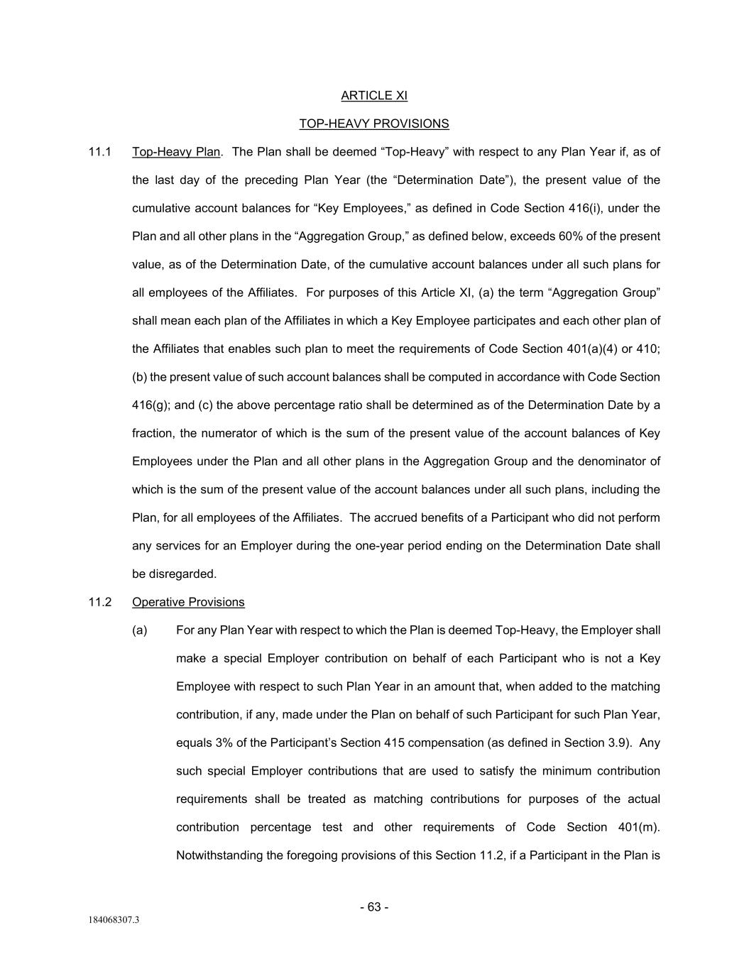 - 63 - 184068307.3 ARTICLE XI TOP-HEAVY PROVISIONS 11.1 Top-Heavy Plan. The Plan shall be deemed “Top-Heavy” with respect to any Plan Year if, as of the last day of the preceding Plan Year (the “Determination Date”), the present value of the cumulative account balances for “Key Employees,” as defined in Code Section 416(i), under the Plan and all other plans in the “Aggregation Group,” as defined below, exceeds 60% of the present value, as of the Determination Date, of the cumulative account balances under all such plans for all employees of the Affiliates. For purposes of this Article XI, (a) the term “Aggregation Group” shall mean each plan of the Affiliates in which a Key Employee participates and each other plan of the Affiliates that enables such plan to meet the requirements of Code Section 401(a)(4) or 410; (b) the present value of such account balances shall be computed in accordance with Code Section 416(g); and (c) the above percentage ratio shall be determined as of the Determination Date by a fraction, the numerator of which is the sum of the present value of the account balances of Key Employees under the Plan and all other plans in the Aggregation Group and the denominator of which is the sum of the present value of the account balances under all such plans, including the Plan, for all employees of the Affiliates. The accrued benefits of a Participant who did not perform any services for an Employer during the one-year period ending on the Determination Date shall be disregarded. 11.2 Operative Provisions (a) For any Plan Year with respect to which the Plan is deemed Top-Heavy, the Employer shall make a special Employer contribution on behalf of each Participant who is not a Key Employee with respect to such Plan Year in an amount that, when added to the matching contribution, if any, made under the Plan on behalf of such Participant for such Plan Year, equals 3% of the Participant’s Section 415 compensation (as defined in Section 3.9). Any such special Employer contributions that are used to satisfy the minimum contribution requirements shall be treated as matching contributions for purposes of the actual contribution percentage test and other requirements of Code Section 401(m). Notwithstanding the foregoing provisions of this Section 11.2, if a Participant in the Plan is