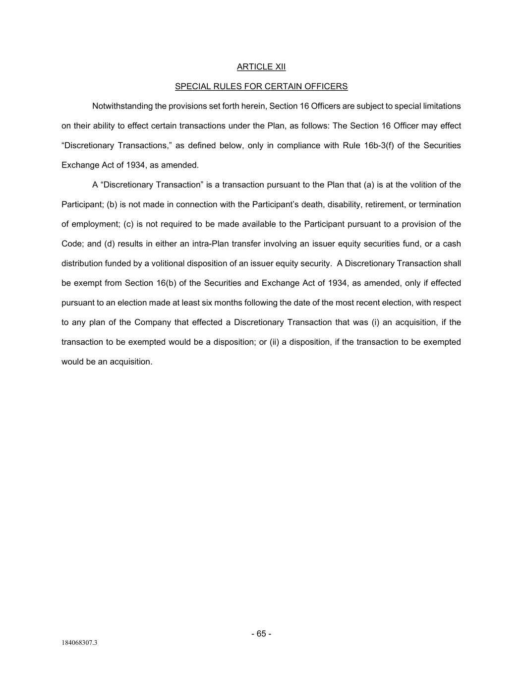 - 65 - 184068307.3 ARTICLE XII SPECIAL RULES FOR CERTAIN OFFICERS Notwithstanding the provisions set forth herein, Section 16 Officers are subject to special limitations on their ability to effect certain transactions under the Plan, as follows: The Section 16 Officer may effect “Discretionary Transactions,” as defined below, only in compliance with Rule 16b-3(f) of the Securities Exchange Act of 1934, as amended. A “Discretionary Transaction” is a transaction pursuant to the Plan that (a) is at the volition of the Participant; (b) is not made in connection with the Participant’s death, disability, retirement, or termination of employment; (c) is not required to be made available to the Participant pursuant to a provision of the Code; and (d) results in either an intra-Plan transfer involving an issuer equity securities fund, or a cash distribution funded by a volitional disposition of an issuer equity security. A Discretionary Transaction shall be exempt from Section 16(b) of the Securities and Exchange Act of 1934, as amended, only if effected pursuant to an election made at least six months following the date of the most recent election, with respect to any plan of the Company that effected a Discretionary Transaction that was (i) an acquisition, if the transaction to be exempted would be a disposition; or (ii) a disposition, if the transaction to be exempted would be an acquisition.