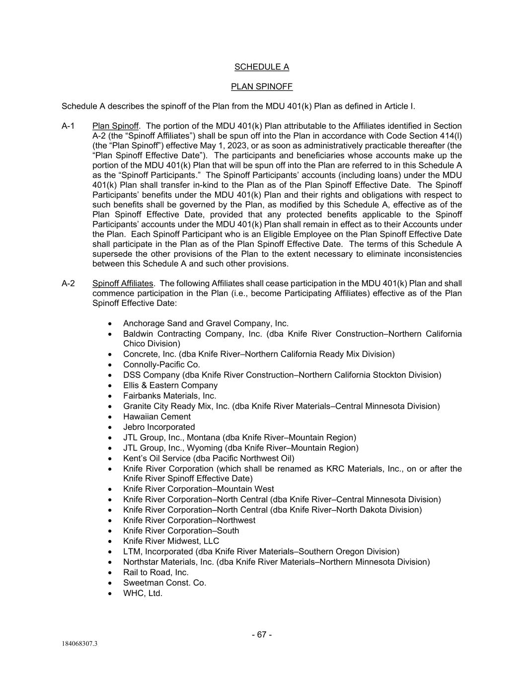 - 67 - 184068307.3 SCHEDULE A PLAN SPINOFF Schedule A describes the spinoff of the Plan from the MDU 401(k) Plan as defined in Article I. A-1 Plan Spinoff. The portion of the MDU 401(k) Plan attributable to the Affiliates identified in Section A-2 (the “Spinoff Affiliates”) shall be spun off into the Plan in accordance with Code Section 414(l) (the “Plan Spinoff”) effective May 1, 2023, or as soon as administratively practicable thereafter (the “Plan Spinoff Effective Date”). The participants and beneficiaries whose accounts make up the portion of the MDU 401(k) Plan that will be spun off into the Plan are referred to in this Schedule A as the “Spinoff Participants.” The Spinoff Participants’ accounts (including loans) under the MDU 401(k) Plan shall transfer in-kind to the Plan as of the Plan Spinoff Effective Date. The Spinoff Participants’ benefits under the MDU 401(k) Plan and their rights and obligations with respect to such benefits shall be governed by the Plan, as modified by this Schedule A, effective as of the Plan Spinoff Effective Date, provided that any protected benefits applicable to the Spinoff Participants’ accounts under the MDU 401(k) Plan shall remain in effect as to their Accounts under the Plan. Each Spinoff Participant who is an Eligible Employee on the Plan Spinoff Effective Date shall participate in the Plan as of the Plan Spinoff Effective Date. The terms of this Schedule A supersede the other provisions of the Plan to the extent necessary to eliminate inconsistencies between this Schedule A and such other provisions. A-2 Spinoff Affiliates. The following Affiliates shall cease participation in the MDU 401(k) Plan and shall commence participation in the Plan (i.e., become Participating Affiliates) effective as of the Plan Spinoff Effective Date: Anchorage Sand and Gravel Company, Inc. Baldwin Contracting Company, Inc. (dba Knife River Construction–Northern California Chico Division) Concrete, Inc. (dba Knife River–Northern California Ready Mix Division) Connolly-Pacific Co. DSS Company (dba Knife River Construction–Northern California Stockton Division) Ellis & Eastern Company Fairbanks Materials, Inc. Granite City Ready Mix, Inc. (dba Knife River Materials–Central Minnesota Division) Hawaiian Cement Jebro Incorporated JTL Group, Inc., Montana (dba Knife River–Mountain Region) JTL Group, Inc., Wyoming (dba Knife River–Mountain Region) Kent’s Oil Service (dba Pacific Northwest Oil) Knife River Corporation (which shall be renamed as KRC Materials, Inc., on or after the Knife River Spinoff Effective Date) Knife River Corporation–Mountain West Knife River Corporation–North Central (dba Knife River–Central Minnesota Division) Knife River Corporation–North Central (dba Knife River–North Dakota Division) Knife River Corporation–Northwest Knife River Corporation–South Knife River Midwest, LLC LTM, Incorporated (dba Knife River Materials–Southern Oregon Division) Northstar Materials, Inc. (dba Knife River Materials–Northern Minnesota Division) Rail to Road, Inc. Sweetman Const. Co. WHC, Ltd.