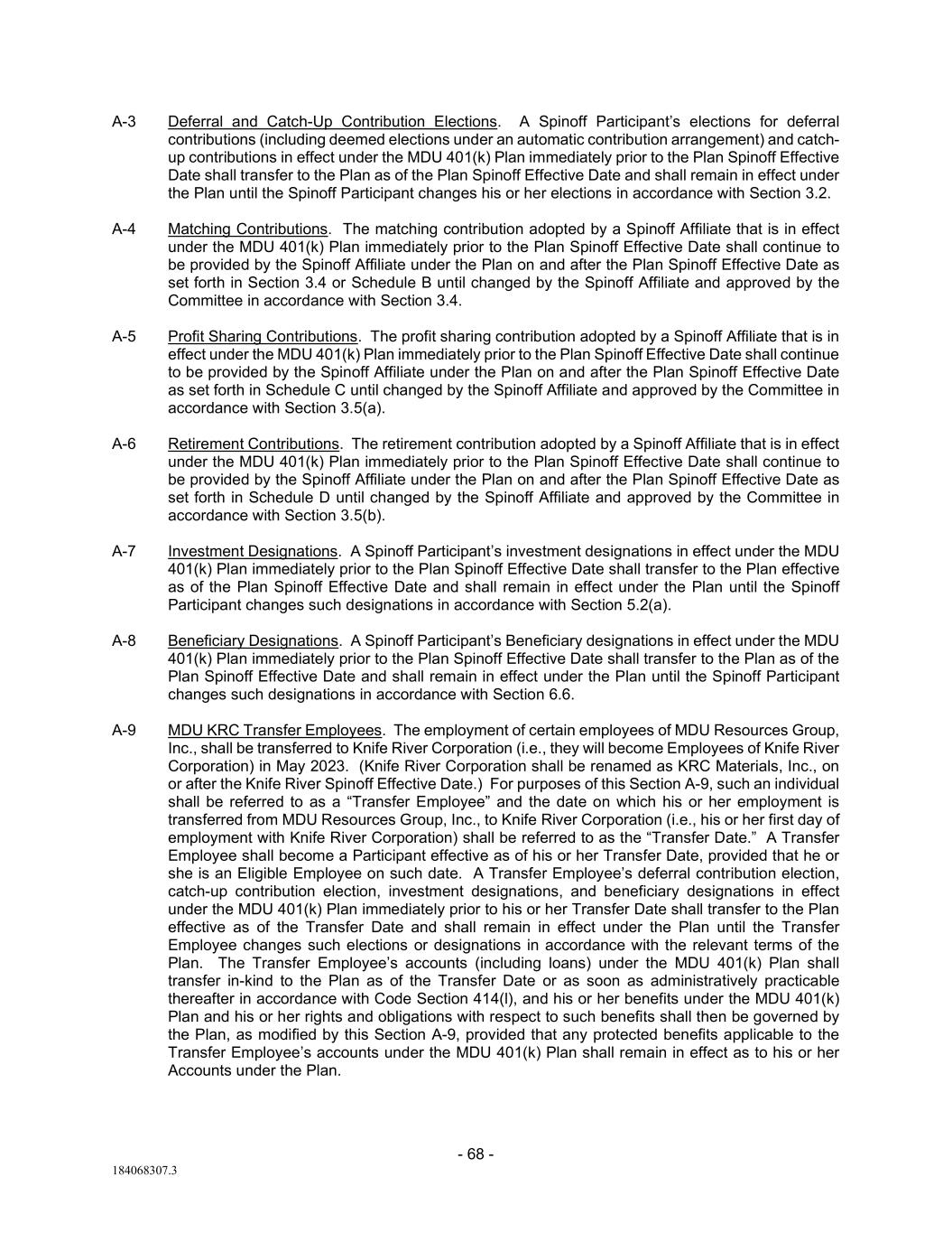 - 68 - 184068307.3 A-3 Deferral and Catch-Up Contribution Elections. A Spinoff Participant’s elections for deferral contributions (including deemed elections under an automatic contribution arrangement) and catch- up contributions in effect under the MDU 401(k) Plan immediately prior to the Plan Spinoff Effective Date shall transfer to the Plan as of the Plan Spinoff Effective Date and shall remain in effect under the Plan until the Spinoff Participant changes his or her elections in accordance with Section 3.2. A-4 Matching Contributions. The matching contribution adopted by a Spinoff Affiliate that is in effect under the MDU 401(k) Plan immediately prior to the Plan Spinoff Effective Date shall continue to be provided by the Spinoff Affiliate under the Plan on and after the Plan Spinoff Effective Date as set forth in Section 3.4 or Schedule B until changed by the Spinoff Affiliate and approved by the Committee in accordance with Section 3.4. A-5 Profit Sharing Contributions. The profit sharing contribution adopted by a Spinoff Affiliate that is in effect under the MDU 401(k) Plan immediately prior to the Plan Spinoff Effective Date shall continue to be provided by the Spinoff Affiliate under the Plan on and after the Plan Spinoff Effective Date as set forth in Schedule C until changed by the Spinoff Affiliate and approved by the Committee in accordance with Section 3.5(a). A-6 Retirement Contributions. The retirement contribution adopted by a Spinoff Affiliate that is in effect under the MDU 401(k) Plan immediately prior to the Plan Spinoff Effective Date shall continue to be provided by the Spinoff Affiliate under the Plan on and after the Plan Spinoff Effective Date as set forth in Schedule D until changed by the Spinoff Affiliate and approved by the Committee in accordance with Section 3.5(b). A-7 Investment Designations. A Spinoff Participant’s investment designations in effect under the MDU 401(k) Plan immediately prior to the Plan Spinoff Effective Date shall transfer to the Plan effective as of the Plan Spinoff Effective Date and shall remain in effect under the Plan until the Spinoff Participant changes such designations in accordance with Section 5.2(a). A-8 Beneficiary Designations. A Spinoff Participant’s Beneficiary designations in effect under the MDU 401(k) Plan immediately prior to the Plan Spinoff Effective Date shall transfer to the Plan as of the Plan Spinoff Effective Date and shall remain in effect under the Plan until the Spinoff Participant changes such designations in accordance with Section 6.6. A-9 MDU KRC Transfer Employees. The employment of certain employees of MDU Resources Group, Inc., shall be transferred to Knife River Corporation (i.e., they will become Employees of Knife River Corporation) in May 2023. (Knife River Corporation shall be renamed as KRC Materials, Inc., on or after the Knife River Spinoff Effective Date.) For purposes of this Section A-9, such an individual shall be referred to as a “Transfer Employee” and the date on which his or her employment is transferred from MDU Resources Group, Inc., to Knife River Corporation (i.e., his or her first day of employment with Knife River Corporation) shall be referred to as the “Transfer Date.” A Transfer Employee shall become a Participant effective as of his or her Transfer Date, provided that he or she is an Eligible Employee on such date. A Transfer Employee’s deferral contribution election, catch-up contribution election, investment designations, and beneficiary designations in effect under the MDU 401(k) Plan immediately prior to his or her Transfer Date shall transfer to the Plan effective as of the Transfer Date and shall remain in effect under the Plan until the Transfer Employee changes such elections or designations in accordance with the relevant terms of the Plan. The Transfer Employee’s accounts (including loans) under the MDU 401(k) Plan shall transfer in-kind to the Plan as of the Transfer Date or as soon as administratively practicable thereafter in accordance with Code Section 414(l), and his or her benefits under the MDU 401(k) Plan and his or her rights and obligations with respect to such benefits shall then be governed by the Plan, as modified by this Section A-9, provided that any protected benefits applicable to the Transfer Employee’s accounts under the MDU 401(k) Plan shall remain in effect as to his or her Accounts under the Plan.