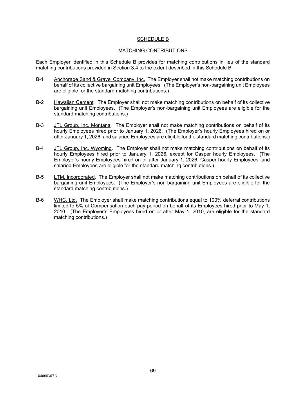 - 69 - 184068307.3 SCHEDULE B MATCHING CONTRIBUTIONS Each Employer identified in this Schedule B provides for matching contributions in lieu of the standard matching contributions provided in Section 3.4 to the extent described in this Schedule B. B-1 Anchorage Sand & Gravel Company, Inc. The Employer shall not make matching contributions on behalf of its collective bargaining unit Employees. (The Employer’s non-bargaining unit Employees are eligible for the standard matching contributions.) B-2 Hawaiian Cement. The Employer shall not make matching contributions on behalf of its collective bargaining unit Employees. (The Employer’s non-bargaining unit Employees are eligible for the standard matching contributions.) B-3 JTL Group, Inc. Montana. The Employer shall not make matching contributions on behalf of its hourly Employees hired prior to January 1, 2026. (The Employer’s hourly Employees hired on or after January 1, 2026, and salaried Employees are eligible for the standard matching contributions.) B-4 JTL Group, Inc. Wyoming. The Employer shall not make matching contributions on behalf of its hourly Employees hired prior to January 1, 2026, except for Casper hourly Employees. (The Employer’s hourly Employees hired on or after January 1, 2026, Casper hourly Employees, and salaried Employees are eligible for the standard matching contributions.) B-5 LTM, Incorporated. The Employer shall not make matching contributions on behalf of its collective bargaining unit Employees. (The Employer’s non-bargaining unit Employees are eligible for the standard matching contributions.) B-6 WHC, Ltd. The Employer shall make matching contributions equal to 100% deferral contributions limited to 5% of Compensation each pay period on behalf of its Employees hired prior to May 1, 2010. (The Employer’s Employees hired on or after May 1, 2010, are eligible for the standard matching contributions.)