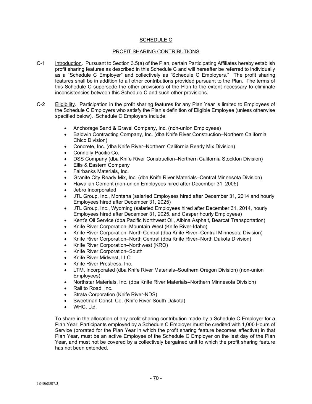 - 70 - 184068307.3 SCHEDULE C PROFIT SHARING CONTRIBUTIONS C-1 Introduction. Pursuant to Section 3.5(a) of the Plan, certain Participating Affiliates hereby establish profit sharing features as described in this Schedule C and will hereafter be referred to individually as a “Schedule C Employer” and collectively as “Schedule C Employers.” The profit sharing features shall be in addition to all other contributions provided pursuant to the Plan. The terms of this Schedule C supersede the other provisions of the Plan to the extent necessary to eliminate inconsistencies between this Schedule C and such other provisions. C-2 Eligibility. Participation in the profit sharing features for any Plan Year is limited to Employees of the Schedule C Employers who satisfy the Plan’s definition of Eligible Employee (unless otherwise specified below). Schedule C Employers include: Anchorage Sand & Gravel Company, Inc. (non-union Employees) Baldwin Contracting Company, Inc. (dba Knife River Construction–Northern California Chico Division) Concrete, Inc. (dba Knife River–Northern California Ready Mix Division) Connolly-Pacific Co. DSS Company (dba Knife River Construction–Northern California Stockton Division) Ellis & Eastern Company Fairbanks Materials, Inc. Granite City Ready Mix, Inc. (dba Knife River Materials–Central Minnesota Division) Hawaiian Cement (non-union Employees hired after December 31, 2005) Jebro Incorporated JTL Group, Inc., Montana (salaried Employees hired after December 31, 2014 and hourly Employees hired after December 31, 2025) JTL Group, Inc., Wyoming (salaried Employees hired after December 31, 2014, hourly Employees hired after December 31, 2025, and Casper hourly Employees) Kent’s Oil Service (dba Pacific Northwest Oil, Albina Asphalt, Bearcat Transportation) Knife River Corporation–Mountain West (Knife River-Idaho) Knife River Corporation–North Central (dba Knife River–Central Minnesota Division) Knife River Corporation–North Central (dba Knife River–North Dakota Division) Knife River Corporation–Northwest (KRO) Knife River Corporation–South Knife River Midwest, LLC Knife River Prestress, Inc. LTM, Incorporated (dba Knife River Materials–Southern Oregon Division) (non-union Employees) Northstar Materials, Inc. (dba Knife River Materials–Northern Minnesota Division) Rail to Road, Inc. Strata Corporation (Knife River-NDS) Sweetman Const. Co. (Knife River-South Dakota) WHC, Ltd. To share in the allocation of any profit sharing contribution made by a Schedule C Employer for a Plan Year, Participants employed by a Schedule C Employer must be credited with 1,000 Hours of Service (prorated for the Plan Year in which the profit sharing feature becomes effective) in that Plan Year, must be an active Employee of the Schedule C Employer on the last day of the Plan Year, and must not be covered by a collectively bargained unit to which the profit sharing feature has not been extended.