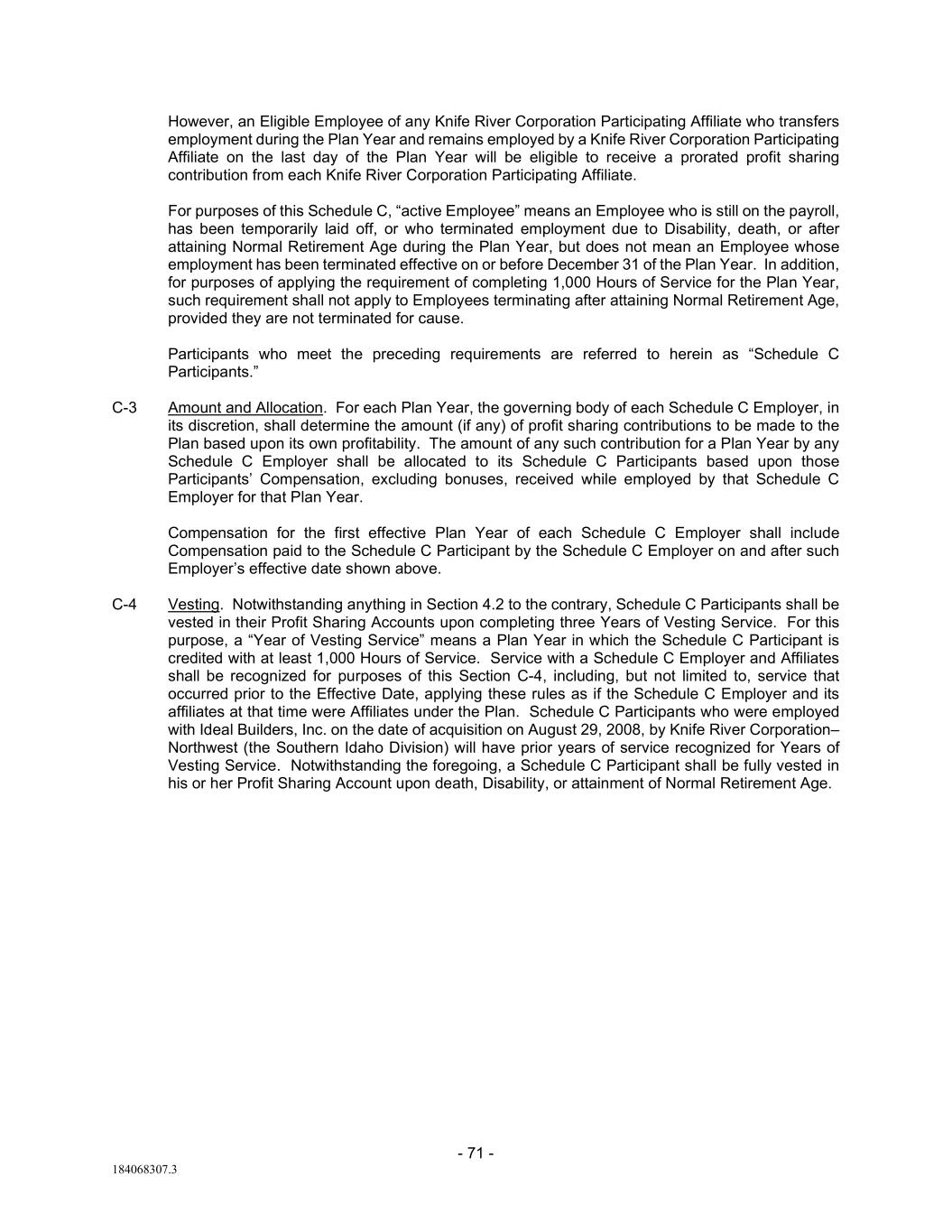 - 71 - 184068307.3 However, an Eligible Employee of any Knife River Corporation Participating Affiliate who transfers employment during the Plan Year and remains employed by a Knife River Corporation Participating Affiliate on the last day of the Plan Year will be eligible to receive a prorated profit sharing contribution from each Knife River Corporation Participating Affiliate. For purposes of this Schedule C, “active Employee” means an Employee who is still on the payroll, has been temporarily laid off, or who terminated employment due to Disability, death, or after attaining Normal Retirement Age during the Plan Year, but does not mean an Employee whose employment has been terminated effective on or before December 31 of the Plan Year. In addition, for purposes of applying the requirement of completing 1,000 Hours of Service for the Plan Year, such requirement shall not apply to Employees terminating after attaining Normal Retirement Age, provided they are not terminated for cause. Participants who meet the preceding requirements are referred to herein as “Schedule C Participants.” C-3 Amount and Allocation. For each Plan Year, the governing body of each Schedule C Employer, in its discretion, shall determine the amount (if any) of profit sharing contributions to be made to the Plan based upon its own profitability. The amount of any such contribution for a Plan Year by any Schedule C Employer shall be allocated to its Schedule C Participants based upon those Participants’ Compensation, excluding bonuses, received while employed by that Schedule C Employer for that Plan Year. Compensation for the first effective Plan Year of each Schedule C Employer shall include Compensation paid to the Schedule C Participant by the Schedule C Employer on and after such Employer’s effective date shown above. C-4 Vesting. Notwithstanding anything in Section 4.2 to the contrary, Schedule C Participants shall be vested in their Profit Sharing Accounts upon completing three Years of Vesting Service. For this purpose, a “Year of Vesting Service” means a Plan Year in which the Schedule C Participant is credited with at least 1,000 Hours of Service. Service with a Schedule C Employer and Affiliates shall be recognized for purposes of this Section C-4, including, but not limited to, service that occurred prior to the Effective Date, applying these rules as if the Schedule C Employer and its affiliates at that time were Affiliates under the Plan. Schedule C Participants who were employed with Ideal Builders, Inc. on the date of acquisition on August 29, 2008, by Knife River Corporation– Northwest (the Southern Idaho Division) will have prior years of service recognized for Years of Vesting Service. Notwithstanding the foregoing, a Schedule C Participant shall be fully vested in his or her Profit Sharing Account upon death, Disability, or attainment of Normal Retirement Age.