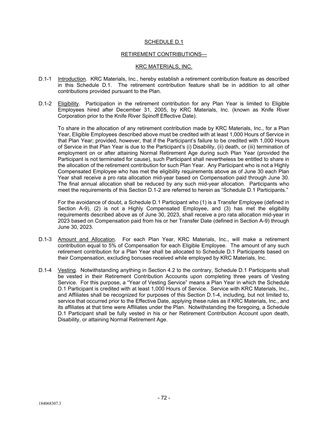 - 72 - 184068307.3 SCHEDULE D.1 RETIREMENT CONTRIBUTIONS— KRC MATERIALS, INC. D.1-1 Introduction. KRC Materials, Inc., hereby establish a retirement contribution feature as described in this Schedule D.1. The retirement contribution feature shall be in addition to all other contributions provided pursuant to the Plan. D.1-2 Eligibility. Participation in the retirement contribution for any Plan Year is limited to Eligible Employees hired after December 31, 2005, by KRC Materials, Inc. (known as Knife River Corporation prior to the Knife River Spinoff Effective Date). To share in the allocation of any retirement contribution made by KRC Materials, Inc., for a Plan Year, Eligible Employees described above must be credited with at least 1,000 Hours of Service in that Plan Year; provided, however, that if the Participant’s failure to be credited with 1,000 Hours of Service in that Plan Year is due to the Participant’s (i) Disability, (ii) death, or (iii) termination of employment on or after attaining Normal Retirement Age during such Plan Year (provided the Participant is not terminated for cause), such Participant shall nevertheless be entitled to share in the allocation of the retirement contribution for such Plan Year. Any Participant who is not a Highly Compensated Employee who has met the eligibility requirements above as of June 30 each Plan Year shall receive a pro rata allocation mid-year based on Compensation paid through June 30. The final annual allocation shall be reduced by any such mid-year allocation. Participants who meet the requirements of this Section D.1-2 are referred to herein as “Schedule D.1 Participants.” For the avoidance of doubt, a Schedule D.1 Participant who (1) is a Transfer Employee (defined in Section A-9), (2) is not a Highly Compensated Employee, and (3) has met the eligibility requirements described above as of June 30, 2023, shall receive a pro rata allocation mid-year in 2023 based on Compensation paid from his or her Transfer Date (defined in Section A-9) through June 30, 2023. D.1-3 Amount and Allocation. For each Plan Year, KRC Materials, Inc., will make a retirement contribution equal to 5% of Compensation for each Eligible Employee. The amount of any such retirement contribution for a Plan Year shall be allocated to Schedule D.1 Participants based on their Compensation, excluding bonuses received while employed by KRC Materials, Inc. D.1-4 Vesting. Notwithstanding anything in Section 4.2 to the contrary, Schedule D.1 Participants shall be vested in their Retirement Contribution Accounts upon completing three years of Vesting Service. For this purpose, a “Year of Vesting Service” means a Plan Year in which the Schedule D.1 Participant is credited with at least 1,000 Hours of Service. Service with KRC Materials, Inc., and Affiliates shall be recognized for purposes of this Section D.1-4, including, but not limited to, service that occurred prior to the Effective Date, applying these rules as if KRC Materials, Inc., and its affiliates at that time were Affiliates under the Plan. Notwithstanding the foregoing, a Schedule D.1 Participant shall be fully vested in his or her Retirement Contribution Account upon death, Disability, or attaining Normal Retirement Age.