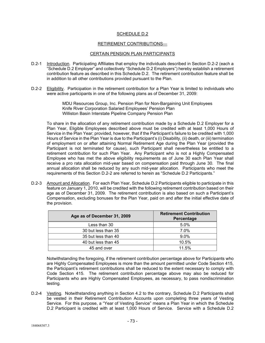 - 73 - 184068307.3 SCHEDULE D.2 RETIREMENT CONTRIBUTIONS— CERTAIN PENSION PLAN PARTICIPANTS D.2-1 Introduction. Participating Affiliates that employ the individuals described in Section D.2-2 (each a “Schedule D.2 Employer” and collectively “Schedule D.2 Employers”) hereby establish a retirement contribution feature as described in this Schedule D.2. The retirement contribution feature shall be in addition to all other contributions provided pursuant to the Plan. D.2-2 Eligibility. Participation in the retirement contribution for a Plan Year is limited to individuals who were active participants in one of the following plans as of December 31, 2009: MDU Resources Group, Inc. Pension Plan for Non-Bargaining Unit Employees Knife River Corporation Salaried Employees’ Pension Plan Williston Basin Interstate Pipeline Company Pension Plan To share in the allocation of any retirement contribution made by a Schedule D.2 Employer for a Plan Year, Eligible Employees described above must be credited with at least 1,000 Hours of Service in the Plan Year; provided, however, that if the Participant’s failure to be credited with 1,000 Hours of Service in the Plan Year is due to the Participant’s (i) Disability, (ii) death, or (iii) termination of employment on or after attaining Normal Retirement Age during the Plan Year (provided the Participant is not terminated for cause), such Participant shall nevertheless be entitled to a retirement contribution for such Plan Year. Any Participant who is not a Highly Compensated Employee who has met the above eligibility requirements as of June 30 each Plan Year shall receive a pro rata allocation mid-year based on compensation paid through June 30. The final annual allocation shall be reduced by any such mid-year allocation. Participants who meet the requirements of this Section D.2-2 are referred to herein as “Schedule D.2 Participants.” D.2-3 Amount and Allocation. For each Plan Year, Schedule D.2 Participants eligible to participate in this feature on January 1, 2010, will be credited with the following retirement contribution based on their age as of December 31, 2009. The retirement contribution is also based on such a Participant’s Compensation, excluding bonuses for the Plan Year, paid on and after the initial effective date of the provision. Age as of December 31, 2009 Retirement Contribution Percentage Less than 30 5.0% 30 but less than 35 7.0% 35 but less than 40 9.0% 40 but less than 45 10.5% 45 and over 11.5% Notwithstanding the foregoing, if the retirement contribution percentage above for Participants who are Highly Compensated Employees is more than the amount permitted under Code Section 415, the Participant’s retirement contributions shall be reduced to the extent necessary to comply with Code Section 415. The retirement contribution percentage above may also be reduced for Participants who are Highly Compensated Employees, as necessary, to pass nondiscrimination testing. D.2-4 Vesting. Notwithstanding anything in Section 4.2 to the contrary, Schedule D.2 Participants shall be vested in their Retirement Contribution Accounts upon completing three years of Vesting Service. For this purpose, a “Year of Vesting Service” means a Plan Year in which the Schedule D.2 Participant is credited with at least 1,000 Hours of Service. Service with a Schedule D.2