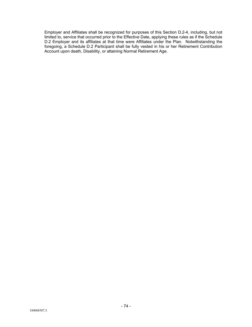 - 74 - 184068307.3 Employer and Affiliates shall be recognized for purposes of this Section D.2-4, including, but not limited to, service that occurred prior to the Effective Date, applying these rules as if the Schedule D.2 Employer and its affiliates at that time were Affiliates under the Plan. Notwithstanding the foregoing, a Schedule D.2 Participant shall be fully vested in his or her Retirement Contribution Account upon death, Disability, or attaining Normal Retirement Age.