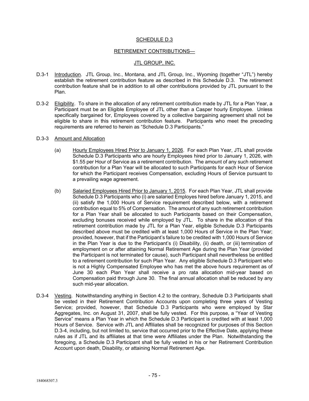 - 75 - 184068307.3 SCHEDULE D.3 RETIREMENT CONTRIBUTIONS— JTL GROUP, INC. D.3-1 Introduction. JTL Group, Inc., Montana, and JTL Group, Inc., Wyoming (together “JTL”) hereby establish the retirement contribution feature as described in this Schedule D.3. The retirement contribution feature shall be in addition to all other contributions provided by JTL pursuant to the Plan. D.3-2 Eligibility. To share in the allocation of any retirement contribution made by JTL for a Plan Year, a Participant must be an Eligible Employee of JTL other than a Casper hourly Employee. Unless specifically bargained for, Employees covered by a collective bargaining agreement shall not be eligible to share in this retirement contribution feature. Participants who meet the preceding requirements are referred to herein as “Schedule D.3 Participants.” D.3-3 Amount and Allocation (a) Hourly Employees Hired Prior to January 1, 2026. For each Plan Year, JTL shall provide Schedule D.3 Participants who are hourly Employees hired prior to January 1, 2026, with $1.55 per Hour of Service as a retirement contribution. The amount of any such retirement contribution for a Plan Year will be allocated to such Participants for each Hour of Service for which the Participant receives Compensation, excluding Hours of Service pursuant to a prevailing wage agreement. (b) Salaried Employees Hired Prior to January 1, 2015. For each Plan Year, JTL shall provide Schedule D.3 Participants who (i) are salaried Employes hired before January 1, 2015, and (ii) satisfy the 1,000 Hours of Service requirement described below, with a retirement contribution equal to 5% of Compensation. The amount of any such retirement contribution for a Plan Year shall be allocated to such Participants based on their Compensation, excluding bonuses received while employed by JTL. To share in the allocation of this retirement contribution made by JTL for a Plan Year, eligible Schedule D.3 Participants described above must be credited with at least 1,000 Hours of Service in the Plan Year; provided, however, that if the Participant’s failure to be credited with 1,000 Hours of Service in the Plan Year is due to the Participant’s (i) Disability, (ii) death, or (iii) termination of employment on or after attaining Normal Retirement Age during the Plan Year (provided the Participant is not terminated for cause), such Participant shall nevertheless be entitled to a retirement contribution for such Plan Year. Any eligible Schedule D.3 Participant who is not a Highly Compensated Employee who has met the above hours requirement as of June 30 each Plan Year shall receive a pro rata allocation mid-year based on Compensation paid through June 30. The final annual allocation shall be reduced by any such mid-year allocation. D.3-4 Vesting. Notwithstanding anything in Section 4.2 to the contrary, Schedule D.3 Participants shall be vested in their Retirement Contribution Accounts upon completing three years of Vesting Service; provided, however, that Schedule D.3 Participants who were employed by Star Aggregates, Inc. on August 31, 2007, shall be fully vested. For this purpose, a “Year of Vesting Service” means a Plan Year in which the Schedule D.3 Participant is credited with at least 1,000 Hours of Service. Service with JTL and Affiliates shall be recognized for purposes of this Section D.3-4, including, but not limited to, service that occurred prior to the Effective Date, applying these rules as if JTL and its affiliates at that time were Affiliates under the Plan. Notwithstanding the foregoing, a Schedule D.3 Participant shall be fully vested in his or her Retirement Contribution Account upon death, Disability, or attaining Normal Retirement Age.
