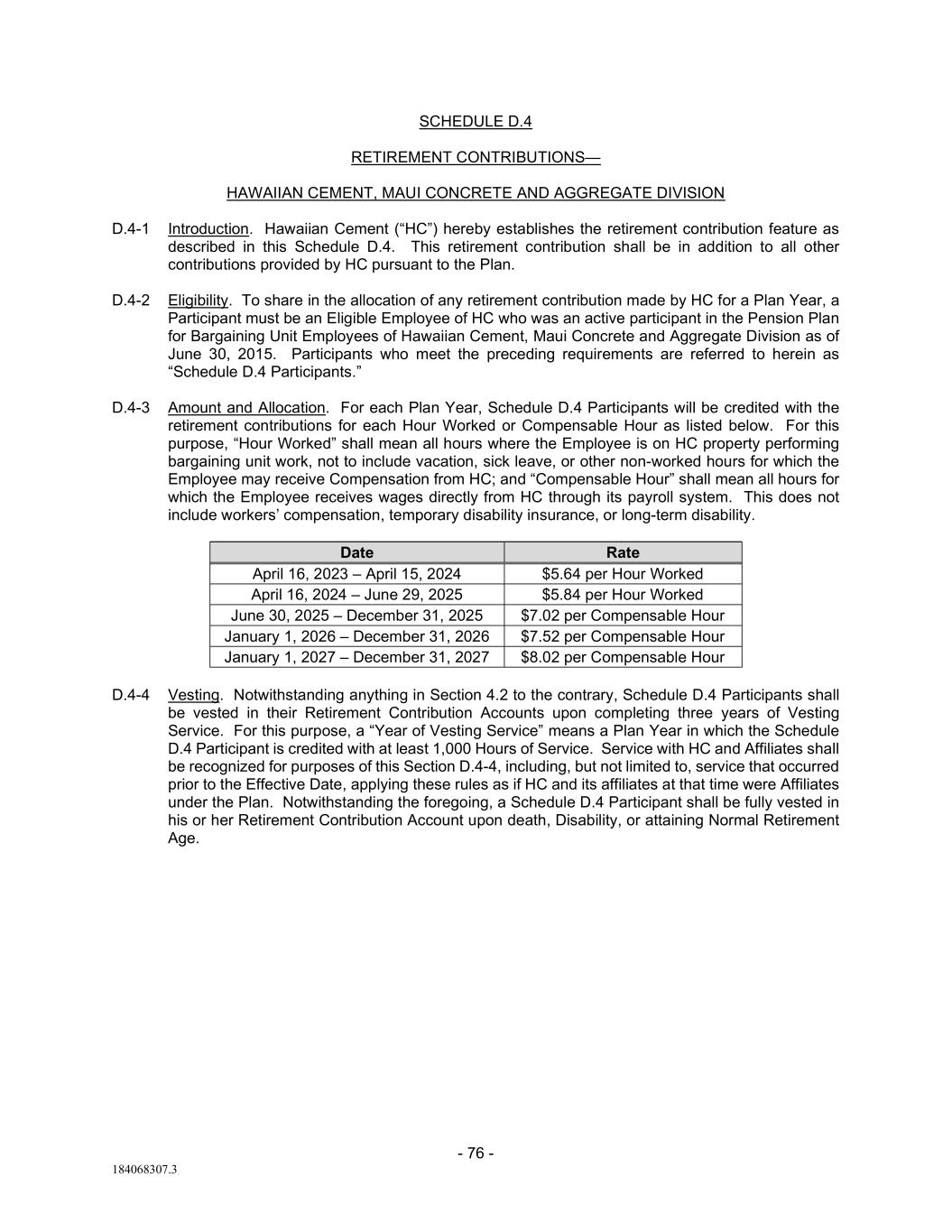 - 76 - 184068307.3 SCHEDULE D.4 RETIREMENT CONTRIBUTIONS— HAWAIIAN CEMENT, MAUI CONCRETE AND AGGREGATE DIVISION D.4-1 Introduction. Hawaiian Cement (“HC”) hereby establishes the retirement contribution feature as described in this Schedule D.4. This retirement contribution shall be in addition to all other contributions provided by HC pursuant to the Plan. D.4-2 Eligibility. To share in the allocation of any retirement contribution made by HC for a Plan Year, a Participant must be an Eligible Employee of HC who was an active participant in the Pension Plan for Bargaining Unit Employees of Hawaiian Cement, Maui Concrete and Aggregate Division as of June 30, 2015. Participants who meet the preceding requirements are referred to herein as “Schedule D.4 Participants.” D.4-3 Amount and Allocation. For each Plan Year, Schedule D.4 Participants will be credited with the retirement contributions for each Hour Worked or Compensable Hour as listed below. For this purpose, “Hour Worked” shall mean all hours where the Employee is on HC property performing bargaining unit work, not to include vacation, sick leave, or other non-worked hours for which the Employee may receive Compensation from HC; and “Compensable Hour” shall mean all hours for which the Employee receives wages directly from HC through its payroll system. This does not include workers’ compensation, temporary disability insurance, or long-term disability. Date Rate April 16, 2023 – April 15, 2024 $5.64 per Hour Worked April 16, 2024 – June 29, 2025 $5.84 per Hour Worked June 30, 2025 – December 31, 2025 $7.02 per Compensable Hour January 1, 2026 – December 31, 2026 $7.52 per Compensable Hour January 1, 2027 – December 31, 2027 $8.02 per Compensable Hour D.4-4 Vesting. Notwithstanding anything in Section 4.2 to the contrary, Schedule D.4 Participants shall be vested in their Retirement Contribution Accounts upon completing three years of Vesting Service. For this purpose, a “Year of Vesting Service” means a Plan Year in which the Schedule D.4 Participant is credited with at least 1,000 Hours of Service. Service with HC and Affiliates shall be recognized for purposes of this Section D.4-4, including, but not limited to, service that occurred prior to the Effective Date, applying these rules as if HC and its affiliates at that time were Affiliates under the Plan. Notwithstanding the foregoing, a Schedule D.4 Participant shall be fully vested in his or her Retirement Contribution Account upon death, Disability, or attaining Normal Retirement Age.