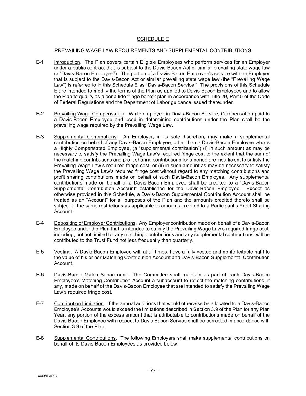 - 77 - 184068307.3 SCHEDULE E PREVAILING WAGE LAW REQUIREMENTS AND SUPPLEMENTAL CONTRIBUTIONS E-1 Introduction. The Plan covers certain Eligible Employees who perform services for an Employer under a public contract that is subject to the Davis-Bacon Act or similar prevailing state wage law (a “Davis-Bacon Employee”). The portion of a Davis-Bacon Employee’s service with an Employer that is subject to the Davis-Bacon Act or similar prevailing state wage law (the “Prevailing Wage Law”) is referred to in this Schedule E as “Davis-Bacon Service.” The provisions of this Schedule E are intended to modify the terms of the Plan as applied to Davis-Bacon Employees and to allow the Plan to qualify as a bona fide fringe benefit plan in accordance with Title 29, Part 5 of the Code of Federal Regulations and the Department of Labor guidance issued thereunder. E-2 Prevailing Wage Compensation. While employed in Davis-Bacon Service, Compensation paid to a Davis-Bacon Employee and used in determining contributions under the Plan shall be the prevailing wage required by the Prevailing Wage Law. E-3 Supplemental Contributions. An Employer, in its sole discretion, may make a supplemental contribution on behalf of any Davis-Bacon Employee, other than a Davis-Bacon Employee who is a Highly Compensated Employee, (a “supplemental contribution”) (i) in such amount as may be necessary to satisfy the Prevailing Wage Law’s required fringe cost to the extent that the sum of the matching contributions and profit sharing contributions for a period are insufficient to satisfy the Prevailing Wage Law’s required fringe cost, or (ii) in such amount as may be necessary to satisfy the Prevailing Wage Law’s required fringe cost without regard to any matching contributions and profit sharing contributions made on behalf of such Davis-Bacon Employee. Any supplemental contributions made on behalf of a Davis-Bacon Employee shall be credited to a “Davis-Bacon Supplemental Contribution Account” established for the Davis-Bacon Employee. Except as otherwise provided in this Schedule, a Davis-Bacon Supplemental Contribution Account shall be treated as an “Account” for all purposes of the Plan and the amounts credited thereto shall be subject to the same restrictions as applicable to amounts credited to a Participant’s Profit Sharing Account. E-4 Depositing of Employer Contributions. Any Employer contribution made on behalf of a Davis-Bacon Employee under the Plan that is intended to satisfy the Prevailing Wage Law’s required fringe cost, including, but not limited to, any matching contributions and any supplemental contributions, will be contributed to the Trust Fund not less frequently than quarterly. E-5 Vesting. A Davis-Bacon Employee will, at all times, have a fully vested and nonforfeitable right to the value of his or her Matching Contribution Account and Davis-Bacon Supplemental Contribution Account. E-6 Davis-Bacon Match Subaccount. The Committee shall maintain as part of each Davis-Bacon Employee’s Matching Contribution Account a subaccount to reflect the matching contributions, if any, made on behalf of the Davis-Bacon Employee that are intended to satisfy the Prevailing Wage Law’s required fringe cost. E-7 Contribution Limitation. If the annual additions that would otherwise be allocated to a Davis-Bacon Employee’s Accounts would exceed the limitations described in Section 3.9 of the Plan for any Plan Year, any portion of the excess amount that is attributable to contributions made on behalf of the Davis-Bacon Employee with respect to Davis Bacon Service shall be corrected in accordance with Section 3.9 of the Plan. E-8 Supplemental Contributions. The following Employers shall make supplemental contributions on behalf of its Davis-Bacon Employees as provided below.