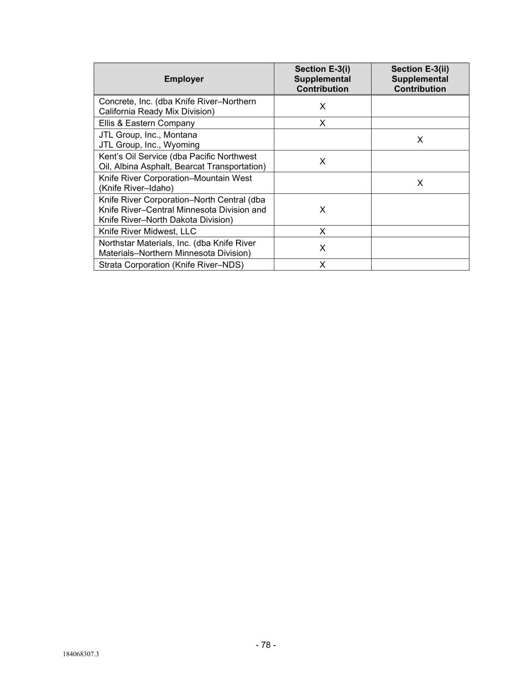 - 78 - 184068307.3 Employer Section E-3(i) Supplemental Contribution Section E-3(ii) Supplemental Contribution Concrete, Inc. (dba Knife River–Northern California Ready Mix Division) X Ellis & Eastern Company X JTL Group, Inc., Montana JTL Group, Inc., Wyoming X Kent’s Oil Service (dba Pacific Northwest Oil, Albina Asphalt, Bearcat Transportation) X Knife River Corporation–Mountain West (Knife River–Idaho) X Knife River Corporation–North Central (dba Knife River–Central Minnesota Division and Knife River–North Dakota Division) X Knife River Midwest, LLC X Northstar Materials, Inc. (dba Knife River Materials–Northern Minnesota Division) X Strata Corporation (Knife River–NDS) X