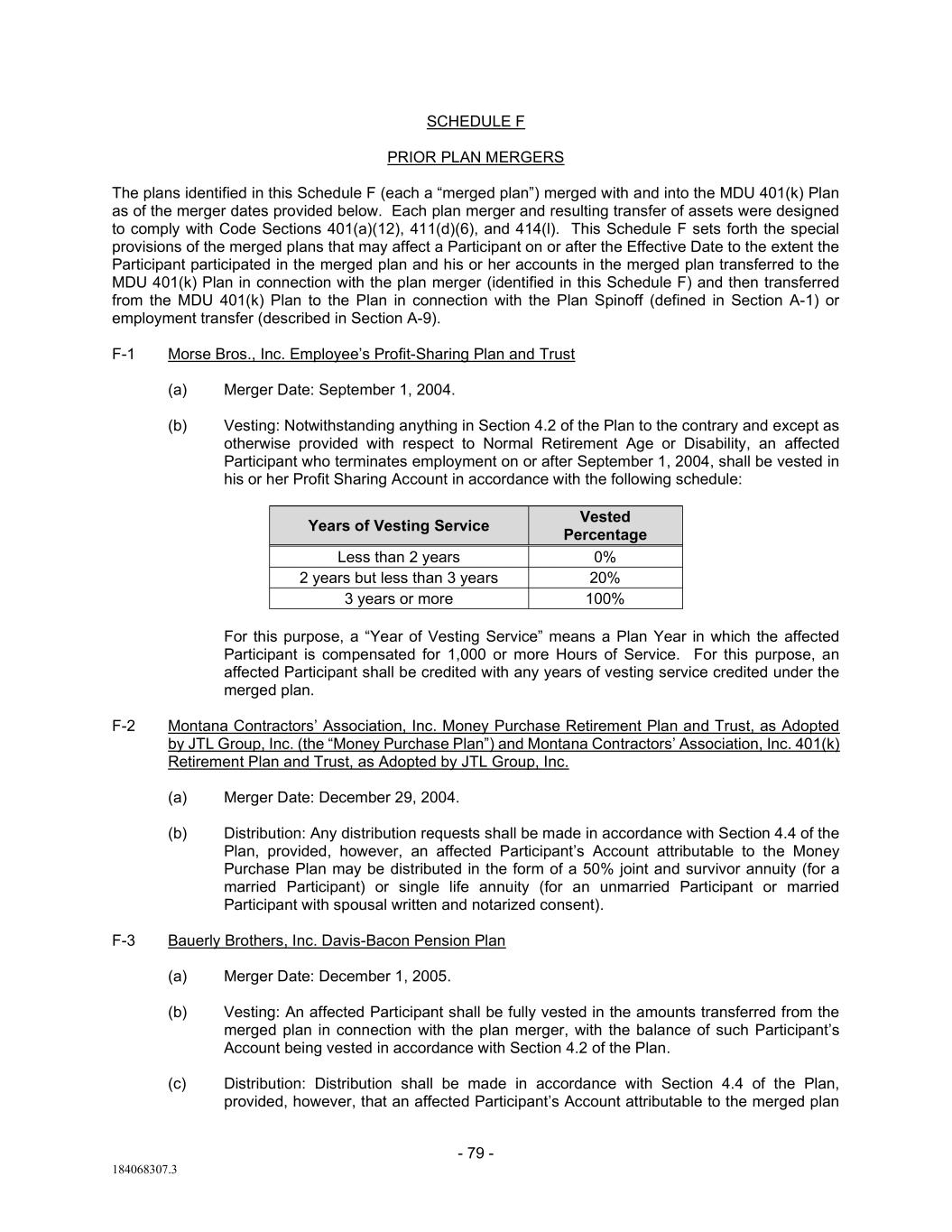 - 79 - 184068307.3 SCHEDULE F PRIOR PLAN MERGERS The plans identified in this Schedule F (each a “merged plan”) merged with and into the MDU 401(k) Plan as of the merger dates provided below. Each plan merger and resulting transfer of assets were designed to comply with Code Sections 401(a)(12), 411(d)(6), and 414(l). This Schedule F sets forth the special provisions of the merged plans that may affect a Participant on or after the Effective Date to the extent the Participant participated in the merged plan and his or her accounts in the merged plan transferred to the MDU 401(k) Plan in connection with the plan merger (identified in this Schedule F) and then transferred from the MDU 401(k) Plan to the Plan in connection with the Plan Spinoff (defined in Section A-1) or employment transfer (described in Section A-9). F-1 Morse Bros., Inc. Employee’s Profit-Sharing Plan and Trust (a) Merger Date: September 1, 2004. (b) Vesting: Notwithstanding anything in Section 4.2 of the Plan to the contrary and except as otherwise provided with respect to Normal Retirement Age or Disability, an affected Participant who terminates employment on or after September 1, 2004, shall be vested in his or her Profit Sharing Account in accordance with the following schedule: Years of Vesting Service Vested Percentage Less than 2 years 0% 2 years but less than 3 years 20% 3 years or more 100% For this purpose, a “Year of Vesting Service” means a Plan Year in which the affected Participant is compensated for 1,000 or more Hours of Service. For this purpose, an affected Participant shall be credited with any years of vesting service credited under the merged plan. F-2 Montana Contractors’ Association, Inc. Money Purchase Retirement Plan and Trust, as Adopted by JTL Group, Inc. (the “Money Purchase Plan”) and Montana Contractors’ Association, Inc. 401(k) Retirement Plan and Trust, as Adopted by JTL Group, Inc. (a) Merger Date: December 29, 2004. (b) Distribution: Any distribution requests shall be made in accordance with Section 4.4 of the Plan, provided, however, an affected Participant’s Account attributable to the Money Purchase Plan may be distributed in the form of a 50% joint and survivor annuity (for a married Participant) or single life annuity (for an unmarried Participant or married Participant with spousal written and notarized consent). F-3 Bauerly Brothers, Inc. Davis-Bacon Pension Plan (a) Merger Date: December 1, 2005. (b) Vesting: An affected Participant shall be fully vested in the amounts transferred from the merged plan in connection with the plan merger, with the balance of such Participant’s Account being vested in accordance with Section 4.2 of the Plan. (c) Distribution: Distribution shall be made in accordance with Section 4.4 of the Plan, provided, however, that an affected Participant’s Account attributable to the merged plan