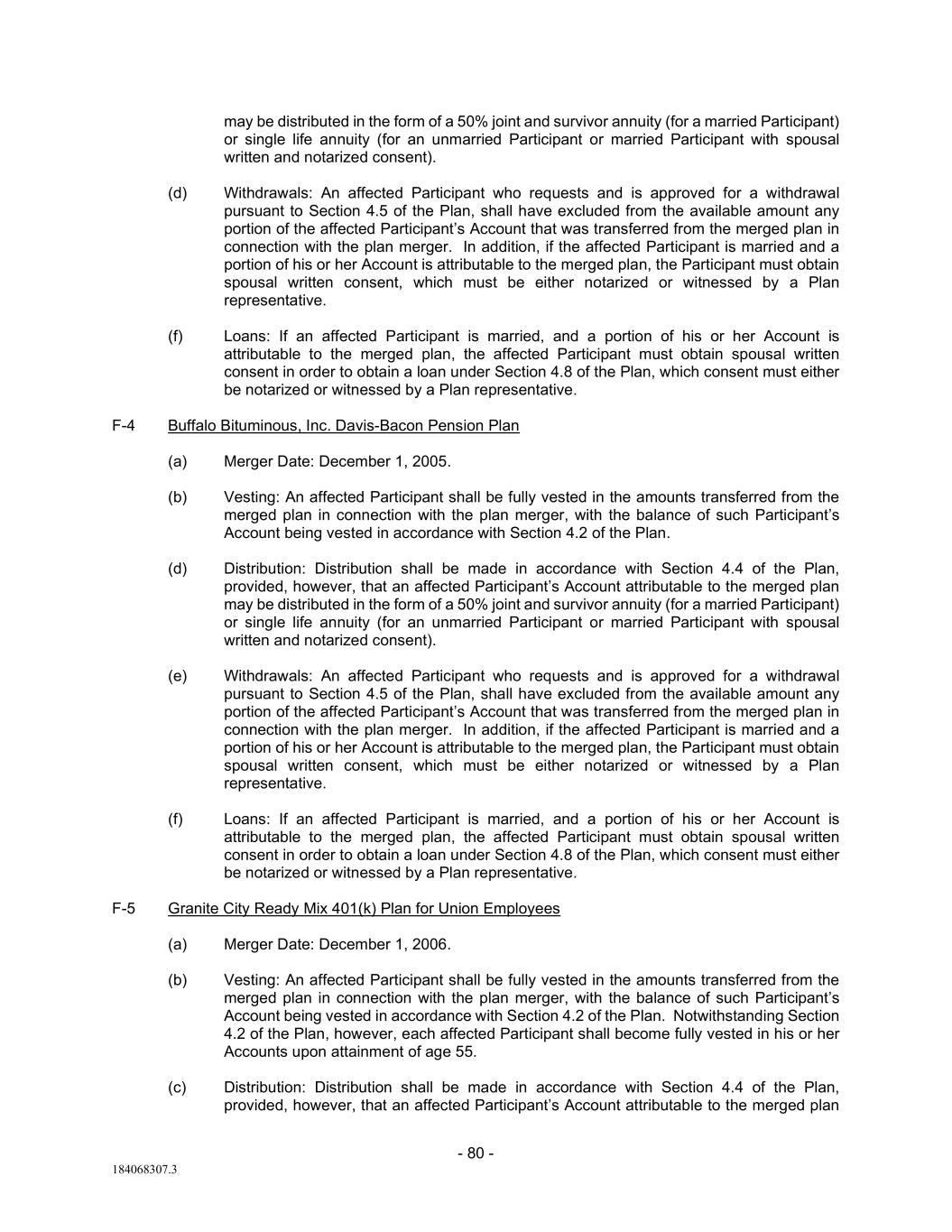 - 80 - 184068307.3 may be distributed in the form of a 50% joint and survivor annuity (for a married Participant) or single life annuity (for an unmarried Participant or married Participant with spousal written and notarized consent). (d) Withdrawals: An affected Participant who requests and is approved for a withdrawal pursuant to Section 4.5 of the Plan, shall have excluded from the available amount any portion of the affected Participant’s Account that was transferred from the merged plan in connection with the plan merger. In addition, if the affected Participant is married and a portion of his or her Account is attributable to the merged plan, the Participant must obtain spousal written consent, which must be either notarized or witnessed by a Plan representative. (f) Loans: If an affected Participant is married, and a portion of his or her Account is attributable to the merged plan, the affected Participant must obtain spousal written consent in order to obtain a loan under Section 4.8 of the Plan, which consent must either be notarized or witnessed by a Plan representative. F-4 Buffalo Bituminous, Inc. Davis-Bacon Pension Plan (a) Merger Date: December 1, 2005. (b) Vesting: An affected Participant shall be fully vested in the amounts transferred from the merged plan in connection with the plan merger, with the balance of such Participant’s Account being vested in accordance with Section 4.2 of the Plan. (d) Distribution: Distribution shall be made in accordance with Section 4.4 of the Plan, provided, however, that an affected Participant’s Account attributable to the merged plan may be distributed in the form of a 50% joint and survivor annuity (for a married Participant) or single life annuity (for an unmarried Participant or married Participant with spousal written and notarized consent). (e) Withdrawals: An affected Participant who requests and is approved for a withdrawal pursuant to Section 4.5 of the Plan, shall have excluded from the available amount any portion of the affected Participant’s Account that was transferred from the merged plan in connection with the plan merger. In addition, if the affected Participant is married and a portion of his or her Account is attributable to the merged plan, the Participant must obtain spousal written consent, which must be either notarized or witnessed by a Plan representative. (f) Loans: If an affected Participant is married, and a portion of his or her Account is attributable to the merged plan, the affected Participant must obtain spousal written consent in order to obtain a loan under Section 4.8 of the Plan, which consent must either be notarized or witnessed by a Plan representative. F-5 Granite City Ready Mix 401(k) Plan for Union Employees (a) Merger Date: December 1, 2006. (b) Vesting: An affected Participant shall be fully vested in the amounts transferred from the merged plan in connection with the plan merger, with the balance of such Participant’s Account being vested in accordance with Section 4.2 of the Plan. Notwithstanding Section 4.2 of the Plan, however, each affected Participant shall become fully vested in his or her Accounts upon attainment of age 55. (c) Distribution: Distribution shall be made in accordance with Section 4.4 of the Plan, provided, however, that an affected Participant’s Account attributable to the merged plan