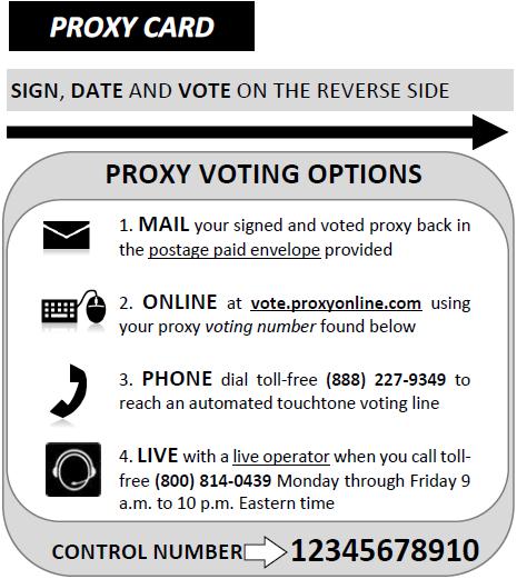 We encourage you to authorize a proxy to vote your Shares via the Internet using the control number that appears on your enclosed proxy card. Use of internet voting will reduce the time and costs associated with this proxy solicitation. Whichever method you choose, please read the enclosed Proxy Statement carefully before you vote. If you should have any questions about this Notice or the proxy materials, we encourage you to call us at (800) 814-0439.