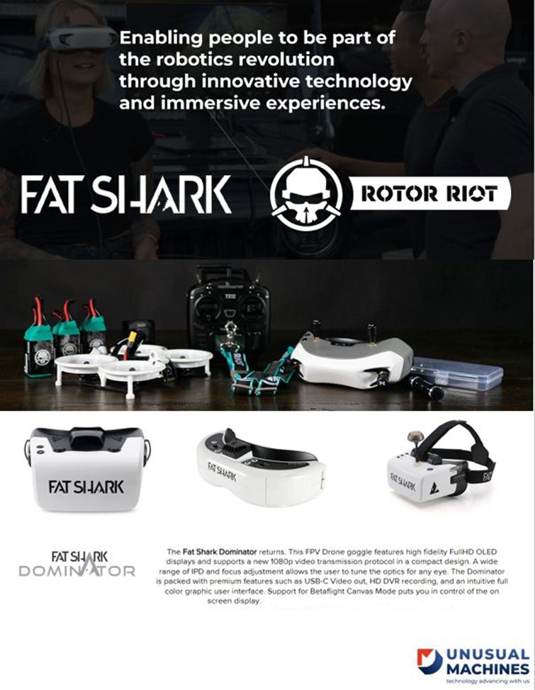 Fat Shark and Rotor Riot principally operate in the drone FPV segment of the industry. This segment focuses on drones piloted with wearable display devices. These are head mounted displays (“HMDs”) or goggles for drone pilots. These goggles give pilots FPV perspective to control their drone in flight. This is a unique experience where the pilot is interacting with an aircraft through visual immersion. In this augmented reality (AR), the pilot sees only what the drone sees, as if sitting in the pilot seat. This experience is accomplished by live streaming footage from a camera mounted on the nose of the drone directly into specially designed goggles worn by the pilot. The image is transmitted via radio (traditionally analog but increasingly digital) to the pilot. The drone remote control unit, the drone, and the FPV goggles are all interconnected via radio. This effect requires sophisticated electronics that transmit visual information with sufficient speed and reliability to allow pilot control over the drone in real-time. Pilots routinely achieve speeds of over 90 mph in racing and other mission critical applications.
