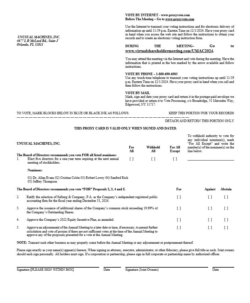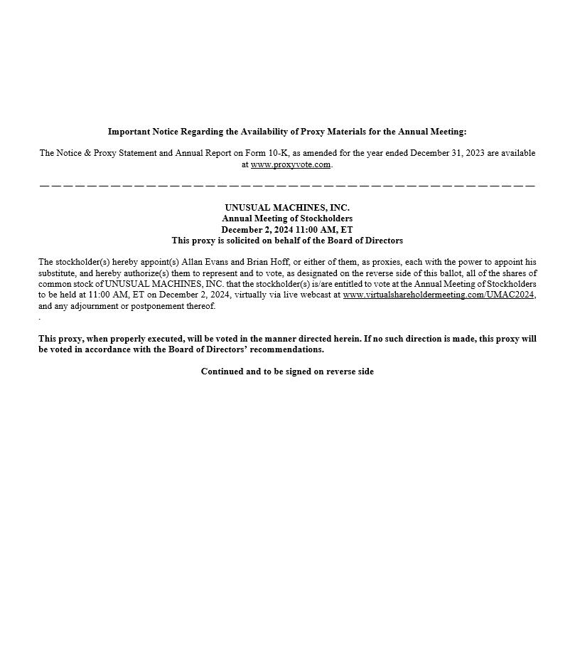 This Proxy Statement is being made available to the holders of shares of the voting stock of Unusual Machines, Inc., a Nevada corporation (“Unusual Machines” or the “Company”) in connection with the solicitation of proxies by our Board of Directors (the “Board”) for use at the 2024 Annual Meeting of Stockholders of Unusual Machines (the “Annual Meeting”) to be held at 11:00 am on December 2, 2024. The Annual Meeting will be a virtual meeting via live webcast and no in person meeting will be held. You will be able to attend the Annual Meeting, vote your shares and submit your questions during the Annual Meeting by visiting www.proxyvote.com. The proxy materials are first being mailed to our stockholders on or about October [__], 2024.