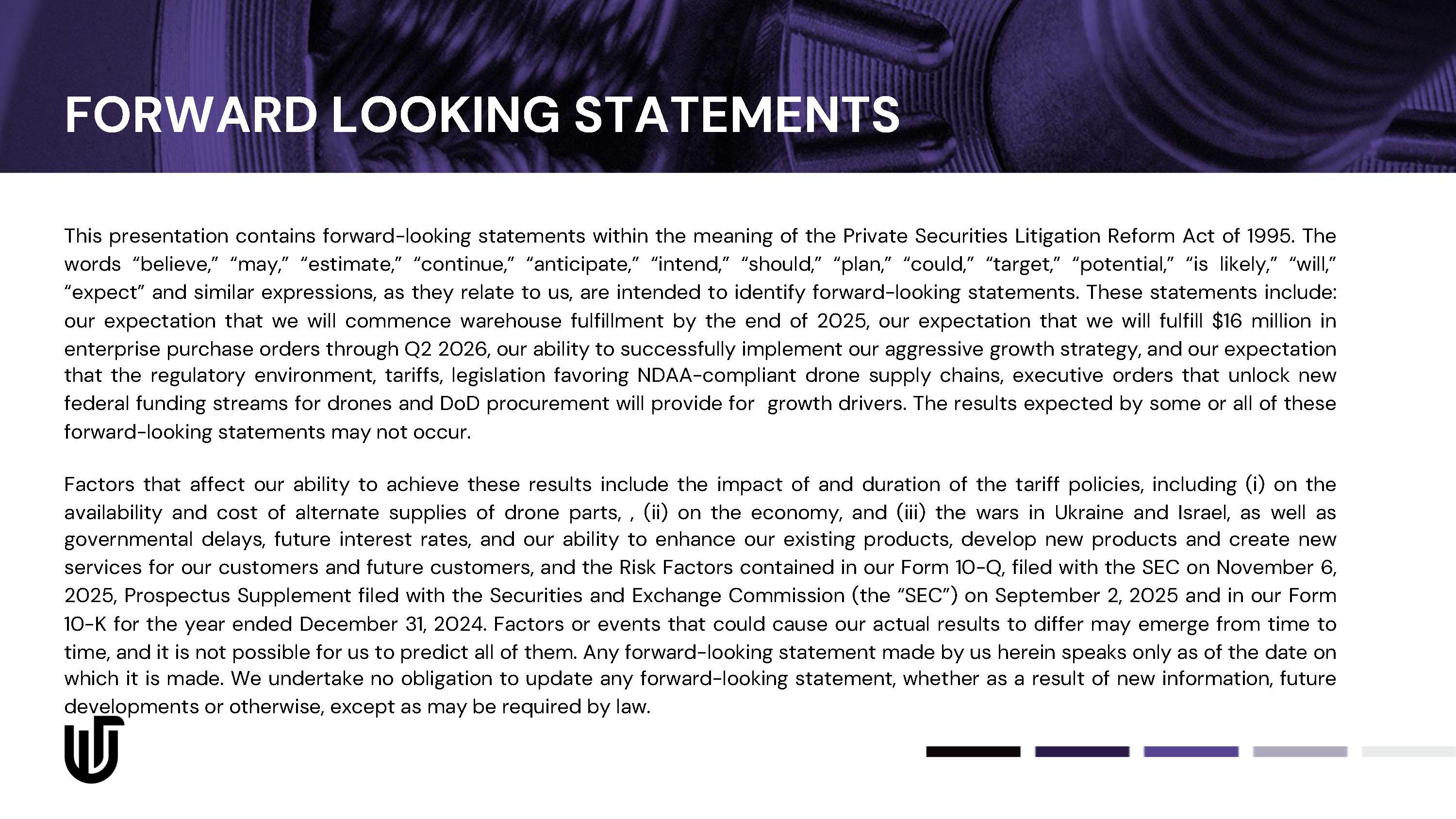 FORWARD LOOKING STATEMENTS This presentation contains forward - looking statements within the meaning of the Private Securities Litigation Reform Act of 1995 . The words “believe,” “may,” “estimate,” “continue,” “anticipate,” “intend,” “should,” “plan,” “could,” “target,” “potential,” “is likely,” “will,” “expect” and similar expressions, as they relate to us, are intended to identify forward - looking statements . These statements include : our expectation that we will commence warehouse fulfillment by the end of 2025 , our expectation that we will fulfill $ 16 million in enterprise purchase orders through Q 2 2026 , our ability to successfully implement our aggressive growth strategy, and our expectation that the regulatory environment, tariffs, legislation favoring NDAA - compliant drone supply chains, executive orders that unlock new federal funding streams for drones and DoD procurement will provide for growth drivers . The results expected by some or all of these forward - looking statements may not occur . Factors that affect our ability to achieve these results include the impact of and duration of the tariff policies, including (i) on the availability and cost of alternate supplies of drone parts, , (ii) on the economy, and (iii) the wars in Ukraine and Israel, as well as governmental delays, future interest rates, and our ability to enhance our existing products, develop new products and create new services for our customers and future customers, and the Risk Factors contained in our Form 10 - Q, filed with the SEC on November 6 , 2025 , Prospectus Supplement filed with the Securities and Exchange Commission (the “SEC”) on September 2 , 2025 and in our Form 10 - K for the year ended December 31 , 2024 . Factors or events that could cause our actual results to differ may emerge from time to time, and it is not possible for us to predict all of them . Any forward - looking statement made by us herein speaks only as of the date on which it is made . We undertake no obligation to update any forward - looking statement, whether as a result of new information, future developments or otherwise, except as may be required by law .