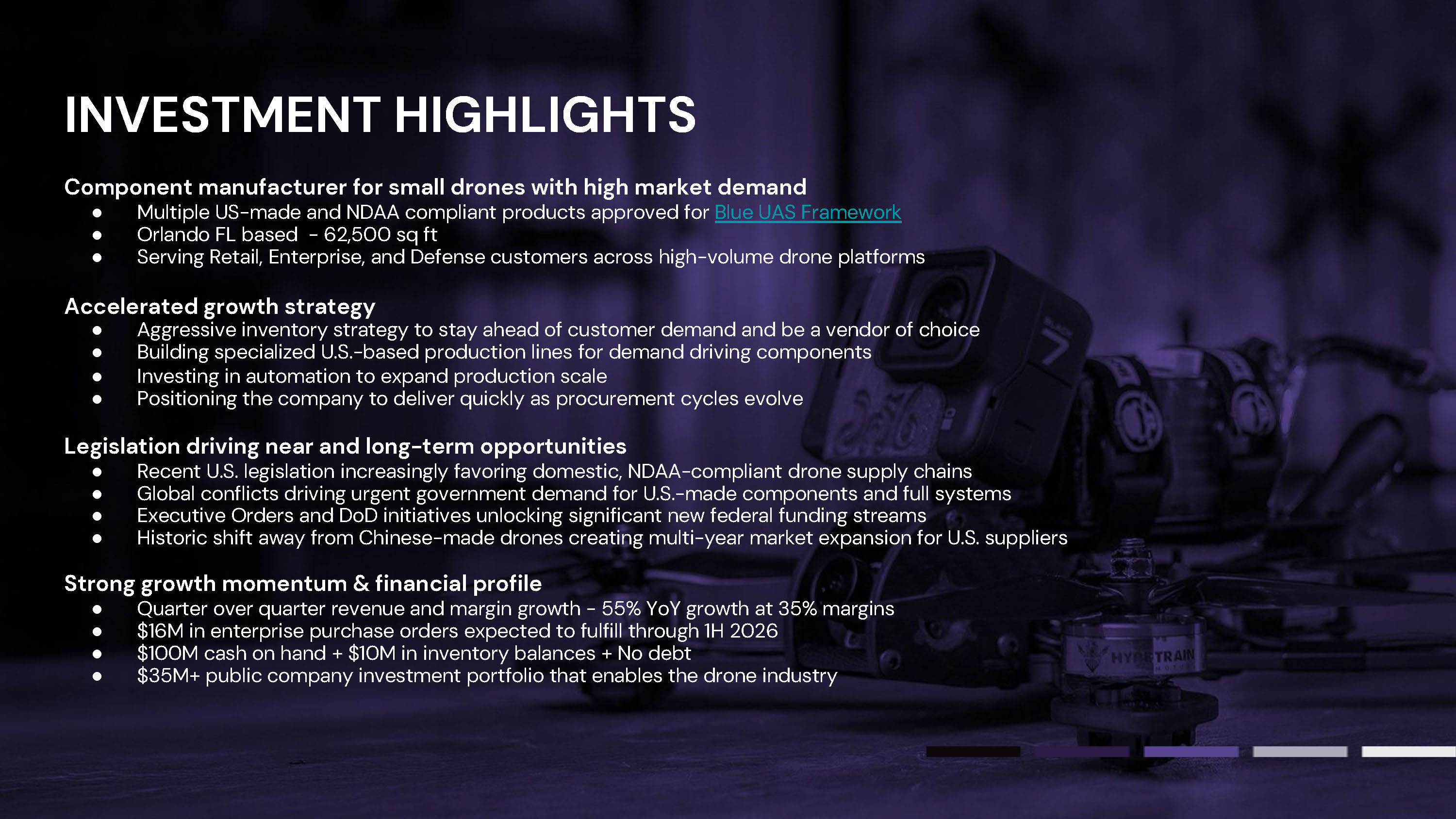 INVESTMENT HIGHLIGHTS Component manufacturer for small drones with high market demand ● Multiple US - made and NDAA compliant products approved for Blue UAS Framework ● Orlando FL based - 62,500 sq ft ● Serving Retail, Enterprise, and Defense customers across high - volume drone platforms Accelerated growth strategy ● Aggressive inventory strategy to stay ahead of customer demand and be a vendor of choice ● Building specialized U.S. - based production lines for demand driving components ● Investing in automation to expand production scale ● Positioning the company to deliver quickly as procurement cycles evolve Legislation driving near and long - term opportunities ● Recent U.S. legislation increasingly favoring domestic, NDAA - compliant drone supply chains ● Global conflicts driving urgent government demand for U.S. - made components and full systems ● Executive Orders and DoD initiatives unlocking significant new federal funding streams ● Historic shift away from Chinese - made drones creating multi - year market expansion for U.S. suppliers Strong growth momentum & financial profile ● Quarter over quarter revenue and margin growth - 55% YoY growth at 35% margins ● $16M in enterprise purchase orders expected to fulfill through 1H 2026 ● $100M cash on hand + $10M in inventory balances + No debt ● $35M+ public company investment portfolio that enables the drone industry
