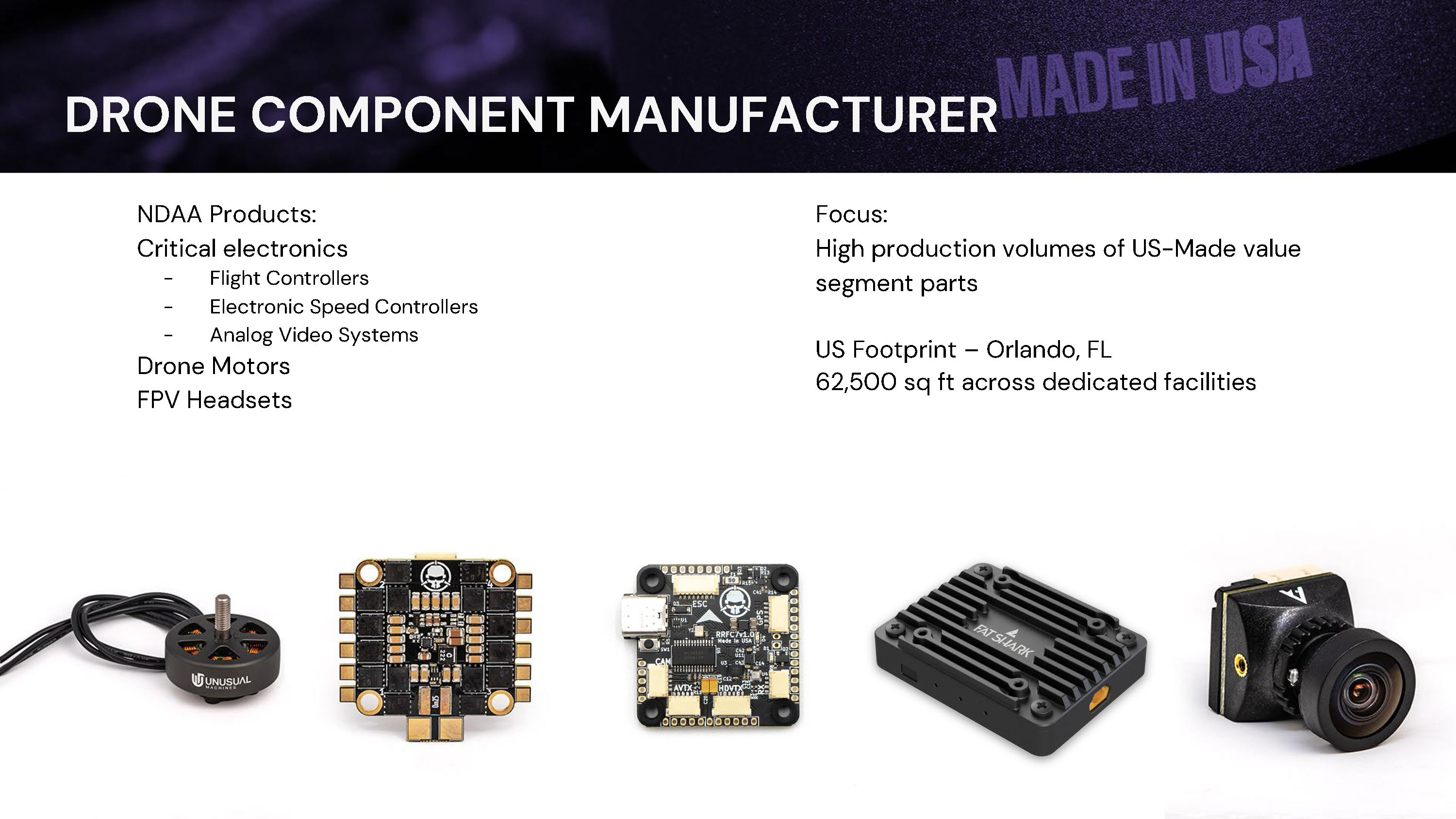 DRONE COMPONENT MANUFACTURER NDAA Products: Critical electronics - Flight Controllers - Electronic Speed Controllers - Analog Video Systems Drone Motors FPV Headsets Focus: High production volumes of US - Made value segment parts US Footprint – Orlando, FL 62,500 sq ft across dedicated facilities
