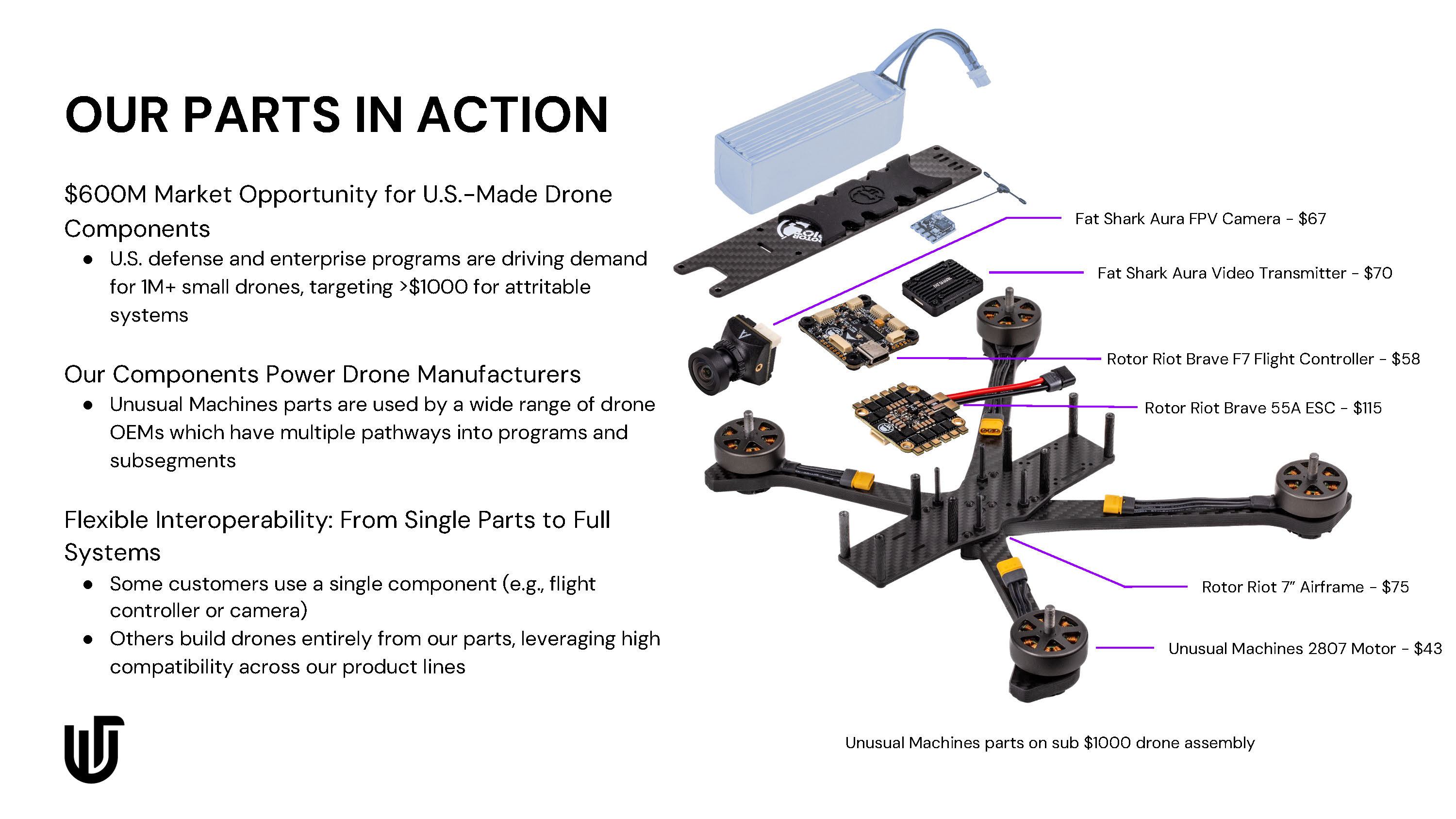 OUR PARTS IN ACTION $600M Market Opportunity for U.S. - Made Drone Components ● U.S. defense and enterprise programs are driving demand for 1M+ small drones, targeting >$1000 for attritable systems Our Components Power Drone Manufacturers ● Unusual Machines parts are used by a wide range of drone OEMs which have multiple pathways into programs and subsegments Flexible Interoperability: From Single Parts to Full Systems ● Some customers use a single component (e.g., flight controller or camera) ● Others build drones entirely from our parts, leveraging high compatibility across our product lines Unusual Machines parts on sub $1000 drone assembly Fat Shark Aura FPV Camera - $67 Fat Shark Aura Video Transmitter - $70 Rotor Riot Brave F7 Flight Controller - $58 Rotor Riot Brave 55A ESC - $115 Unusual Machines 2807 Motor - $43 Rotor Riot 7” Airframe - $75