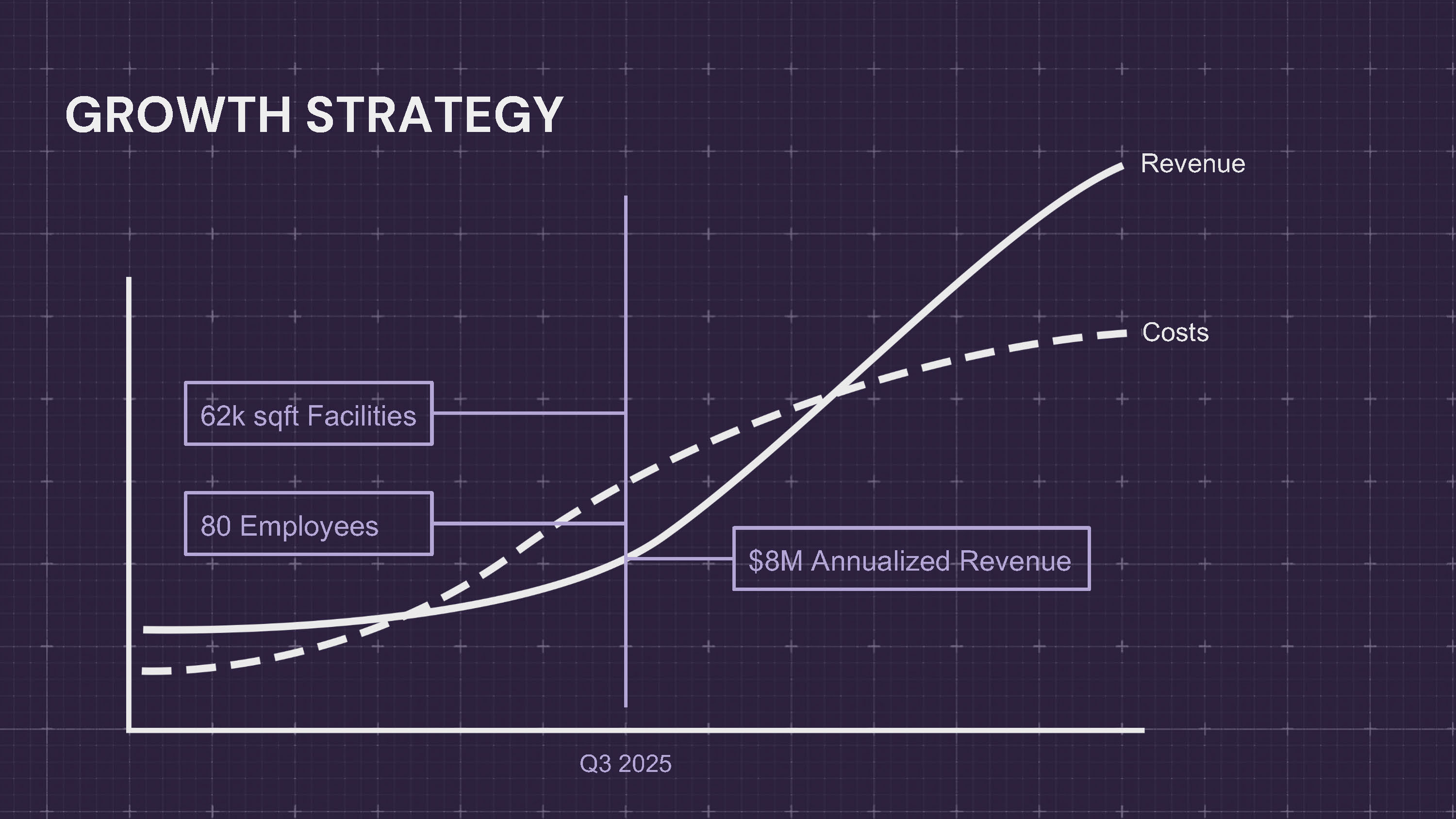 GROWTH STRATEGY $8M Annualized Revenue 80 Employees 62k sqft Facilities Q3 2025 Revenue Costs