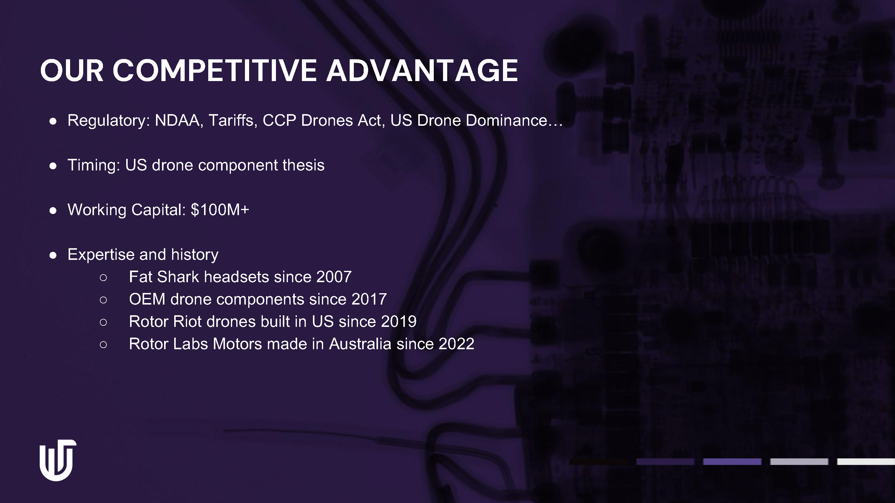 OUR COMPETITIVE ADVANTAGE ● Regulatory: NDAA, Tariffs, CCP Drones Act, US Drone Dominance… ● Timing: US drone component thesis ● Working Capital: $100M+ ● Expertise and history ○ Fat Shark headsets since 2007 ○ OEM drone components since 2017 ○ Rotor Riot drones built in US since 2019 ○ Rotor Labs Motors made in Australia since 2022