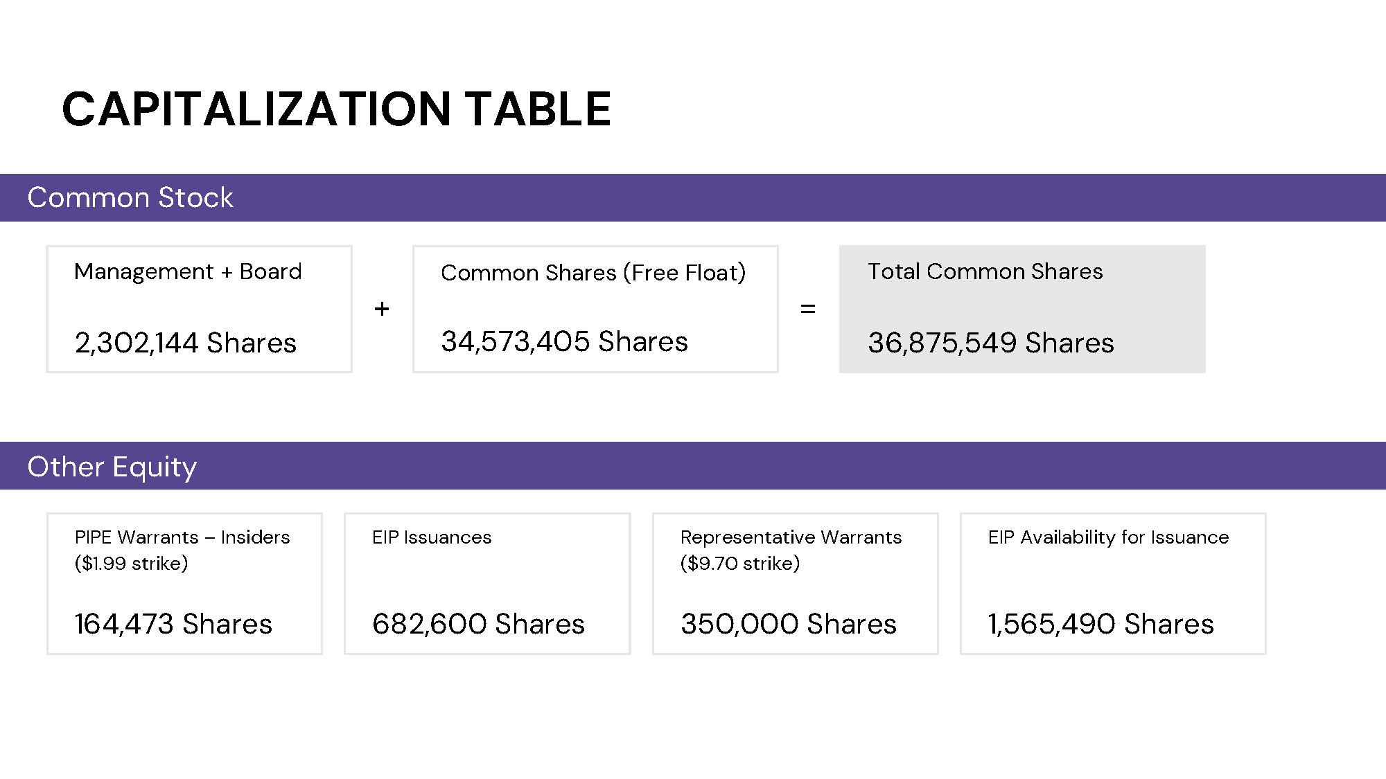 CAPITALIZATION TABLE Common Stock Management + Board 2,302,144 Shares + Common Shares (Free Float) 34,573,405 Shares = Total Common Shares 36,875,549 Shares Other Equity PIPE Warrants – Insiders ($1.99 strike) 164,473 Shares EIP Issuances 682,600 Shares Representative Warrants ($9.70 strike) 350,000 Shares EIP Availability for Issuance 1,565,490 Shares