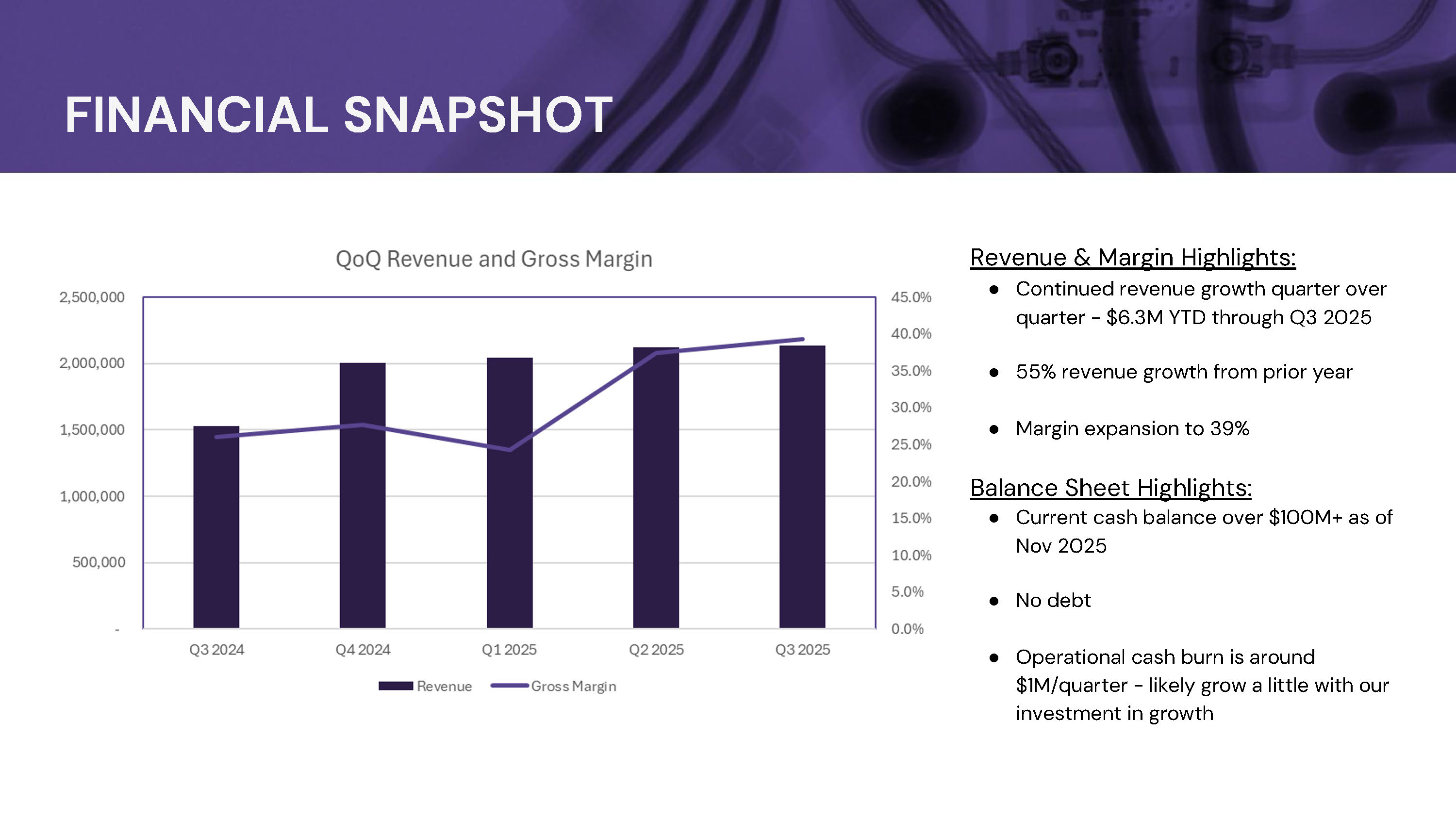 FINANCIAL SNAPSHOT Revenue & Margin Highlights: ● Continued revenue growth quarter over quarter - $6.3M YTD through Q3 2025 ● 55% revenue growth from prior year ● Margin expansion to 39% Balance Sheet Highlights: ● Current cash balance over $100M+ as of Nov 2025 ● No debt ● Operational cash burn is around $1M/quarter - likely grow a little with our investment in growth