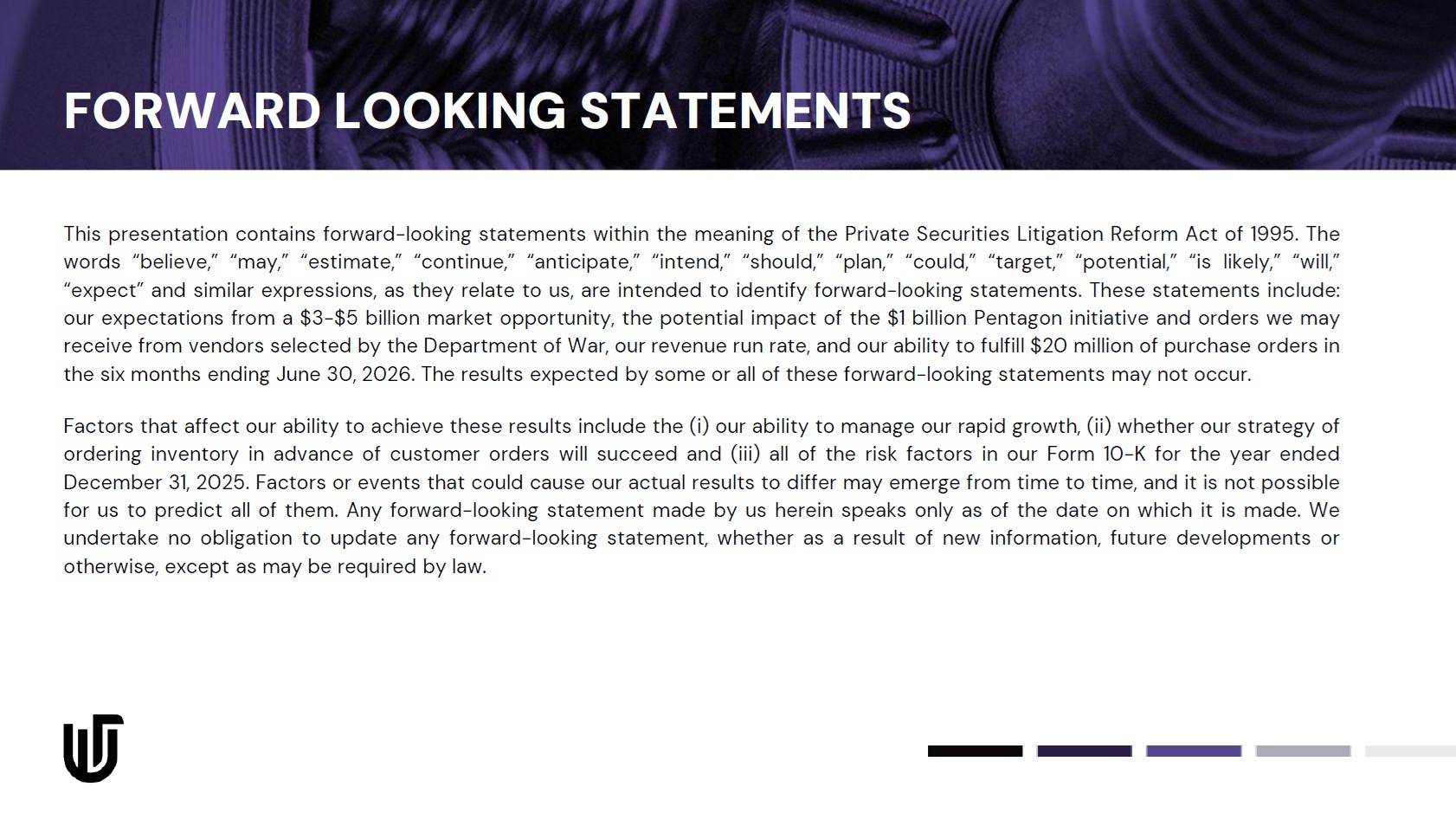 FORWARD LOOKING STATEMENTS This presentation contains forward - looking statements within the meaning of the Private Securities Litigation Reform Act of 1995 . The words “believe,” “may,” “estimate,” “continue,” “anticipate,” “intend,” “should,” “plan,” “could,” “target,” “potential,” “is likely,” “will,” “expect” and similar expressions, as they relate to us, are intended to identify forward - looking statements . These statements include : our expectations from a $ 3 - $ 5 billion market opportunity, the potential impact of the $ 1 billion Pentagon initiative and orders we may receive from vendors selected by the Department of War, our revenue run rate, and our ability to fulfill $ 20 million of purchase orders in the six months ending June 30 , 2026 . The results expected by some or all of these forward - looking statements may not occur . Factors that affect our ability to achieve these results include the (i) our ability to manage our rapid growth, (ii) whether our strategy of ordering inventory in advance of customer orders will succeed and (iii) all of the risk factors in our Form 10 - K for the year ended December 31 , 2025 . Factors or events that could cause our actual results to differ may emerge from time to time, and it is not possible for us to predict all of them . Any forward - looking statement made by us herein speaks only as of the date on which it is made . We undertake no obligation to update any forward - looking statement, whether as a result of new information, future developments or otherwise, except as may be required by law .