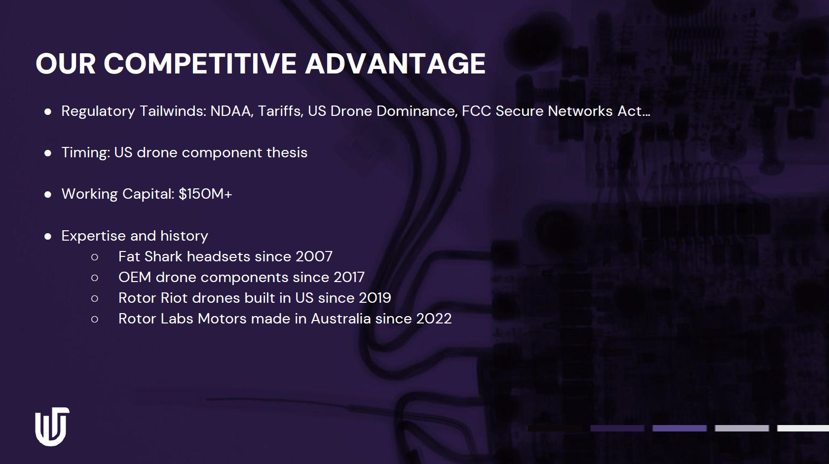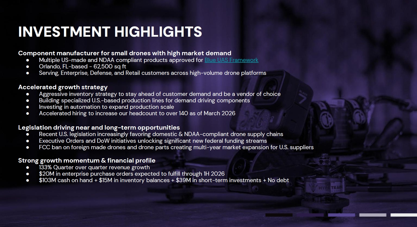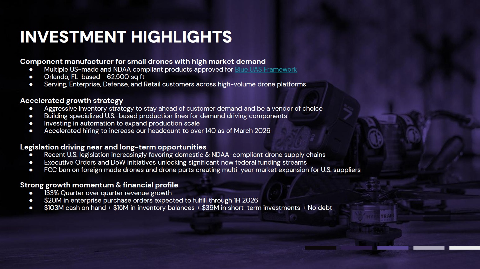 INVESTMENT HIGHLIGHTS Component manufacturer for small drones with high market demand ● Multiple US - made and NDAA compliant products approved for Blue UAS Framework ● Orlando, FL - based - 62,500 sq ft ● Serving, Enterprise, Defense, and Retail customers across high - volume drone platforms Accelerated growth strategy ● Aggressive inventory strategy to stay ahead of customer demand and be a vendor of choice ● Building specialized U.S. - based production lines for demand driving components ● Investing in automation to expand production scale ● Accelerated hiring to increase our headcount to over 140 as of March 2026 Legislation driving near and long - term opportunities ● Recent U.S. legislation increasingly favoring domestic & NDAA - compliant drone supply chains ● Executive Orders and DoW initiatives unlocking significant new federal funding streams ● FCC ban on foreign made drones and drone parts creating multi - year market expansion for U.S. suppliers Strong growth momentum & financial profile ● 133% Quarter over quarter revenue growth ● $20M in enterprise purchase orders expected to fulfill through 1H 2026 ● $103M cash on hand + $15M in inventory balances + $39M in short - term investments + No debt